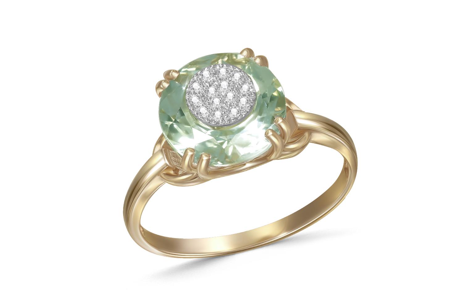 Аметист зеленый натуральный, количество 1 шт., огранка круг с отв., размер 10 мм ; Бриллиант, количество 14 шт., огранка Кр-57, размер 1 мм, цвет 4, чистота 5, вес 0,06 карат.