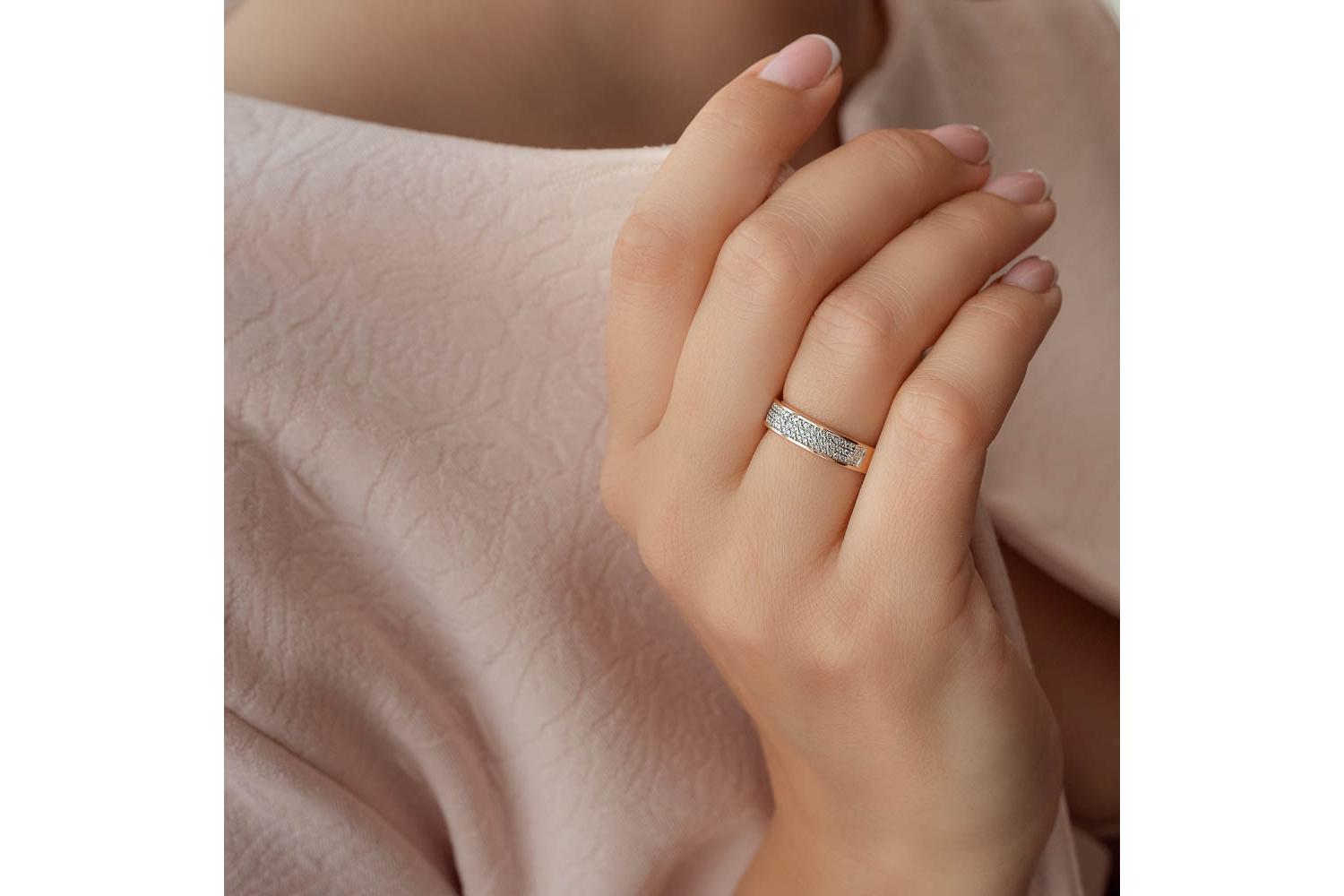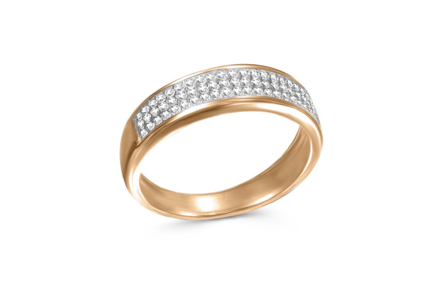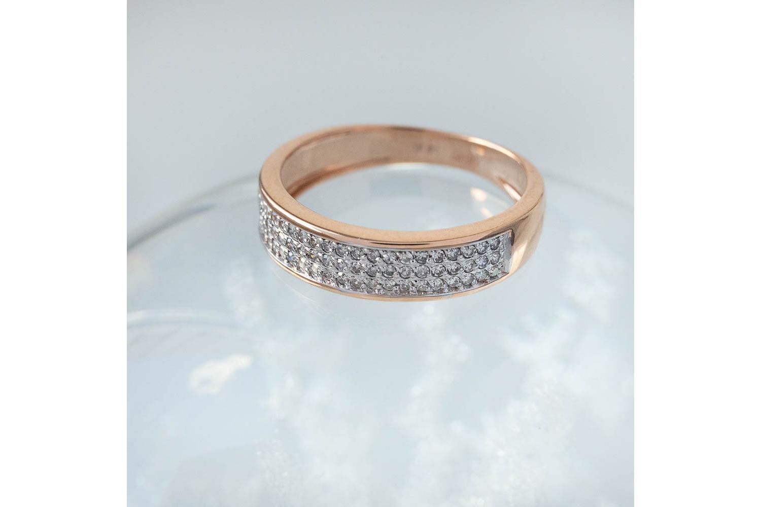 Изящное кольцо-дорожка, выполненное в благородном красном золоте, притягивает взгляд своей элегантной симметрией. Бриллианты, аккуратно закрепленные в центральной части изделия, создают ослепительную россыпь сверкающих граней.