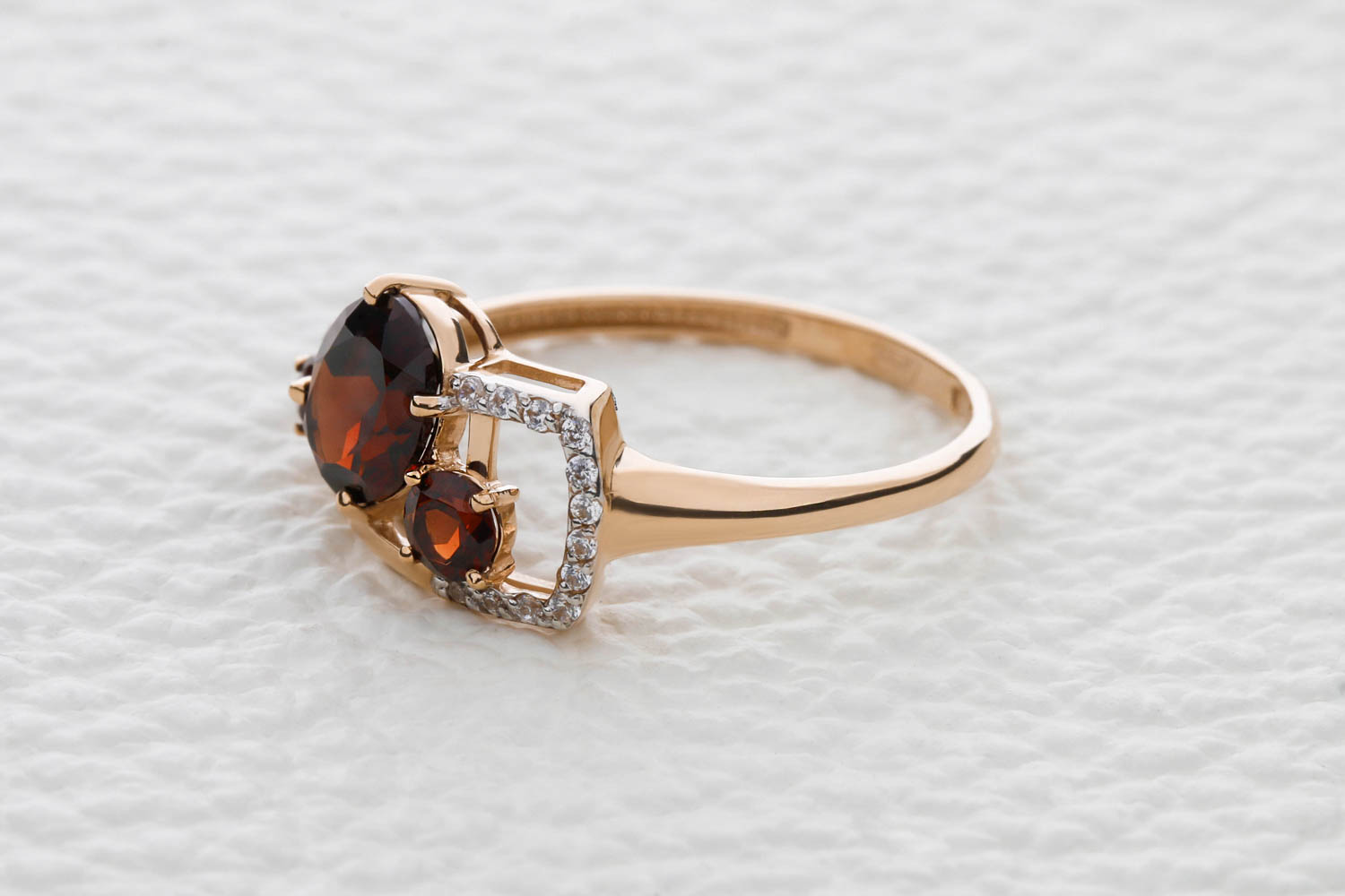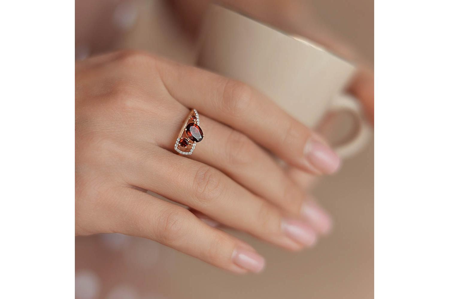 Мастера компании NEWGOLD, приложив всё свое мастерство и искусство, создали для Вас на нашем собственном производстве Кольцо из красного золота с 3 гранатами и 18 фианитами.