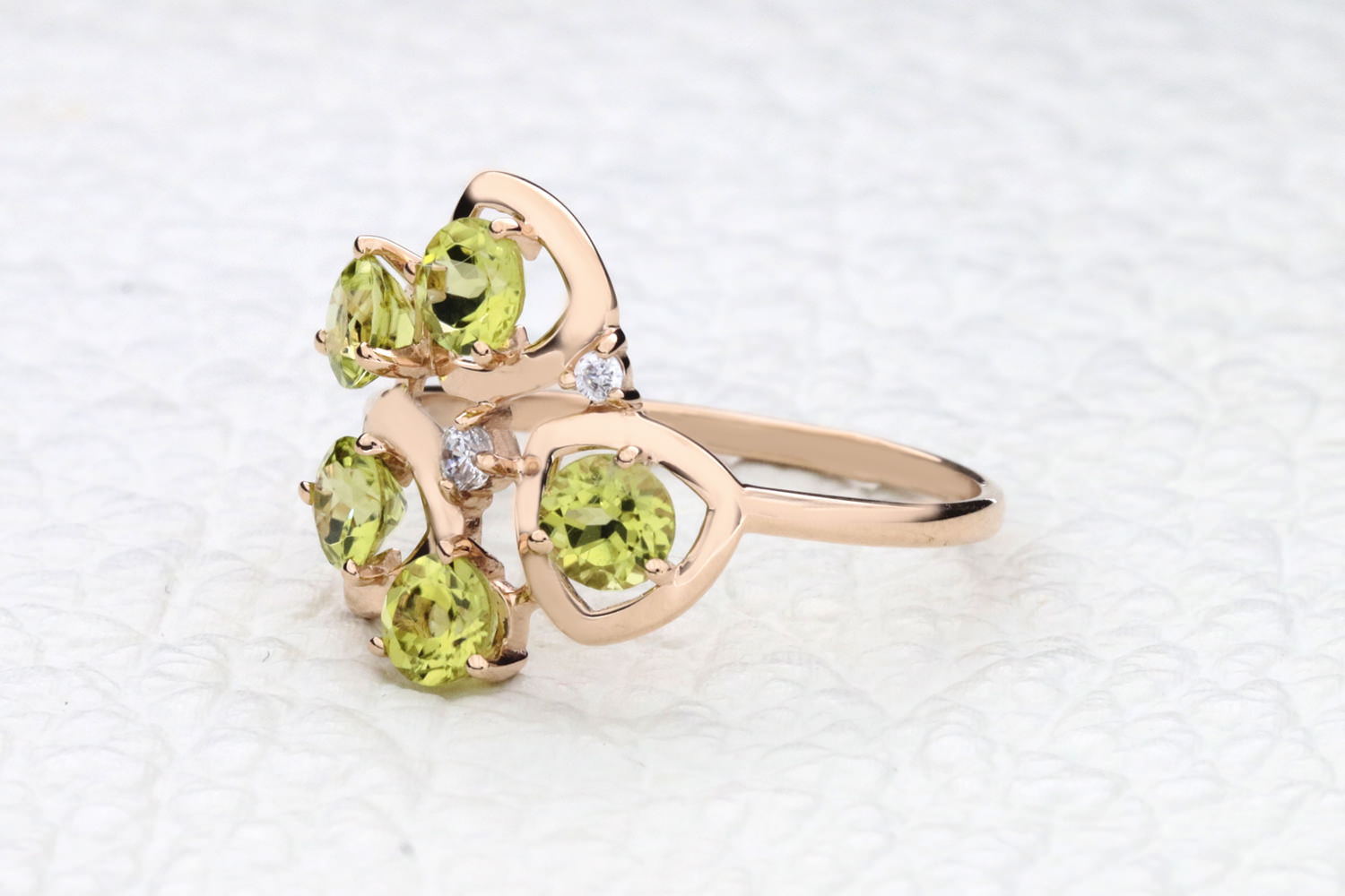 Мастера компании NEWGOLD, приложив всё свое мастерство и искусство, создали для Вас на нашем собственном производстве Кольцо из красного золота с 5 хризолитами и 2 фианитами.