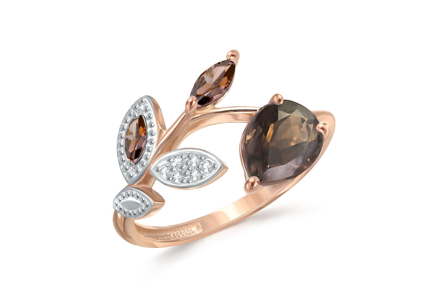 Мастера компании NEWGOLD, приложив всё свое мастерство и искусство, создали для Вас на нашем собственном производстве Кольцо Веточка из красного золота с раухтопазом и 8 фианитами.