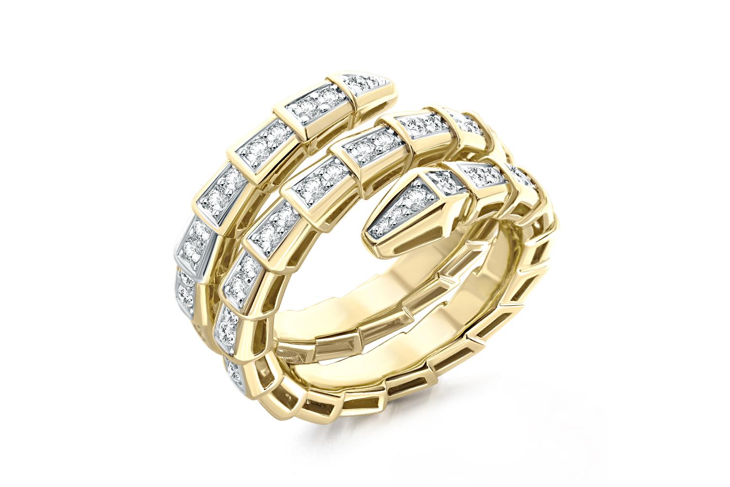 Мастера компании NEWGOLD, приложив всё свое мастерство и искусство, создали для Вас на нашем собственном производстве Кольцо Змея из жёлтого золота с 74 выращенными бриллиантами.