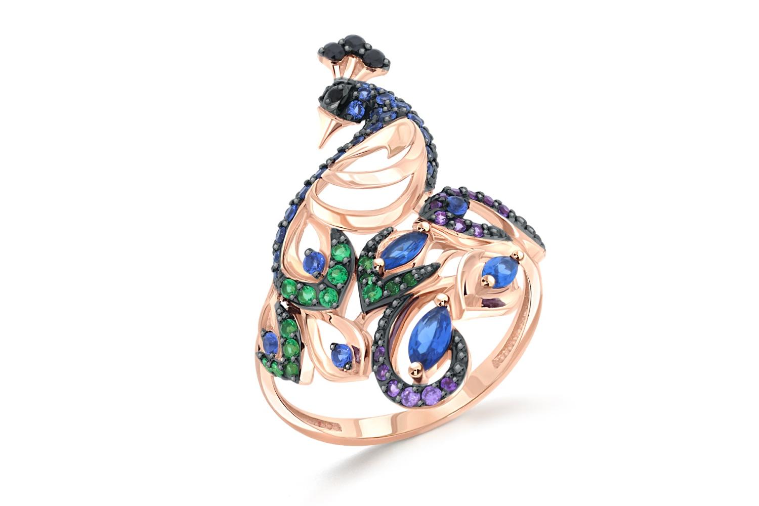 Цветовая палитра поражает воображение: глубокие синие сапфиры, изумрудно-зеленые гранаты, иссиня-черные и аметистовые вкрапления фианитов. Плавные изгибы металла имитируют развевающиеся перья, а камни словно танцуют в причудливой композиции.