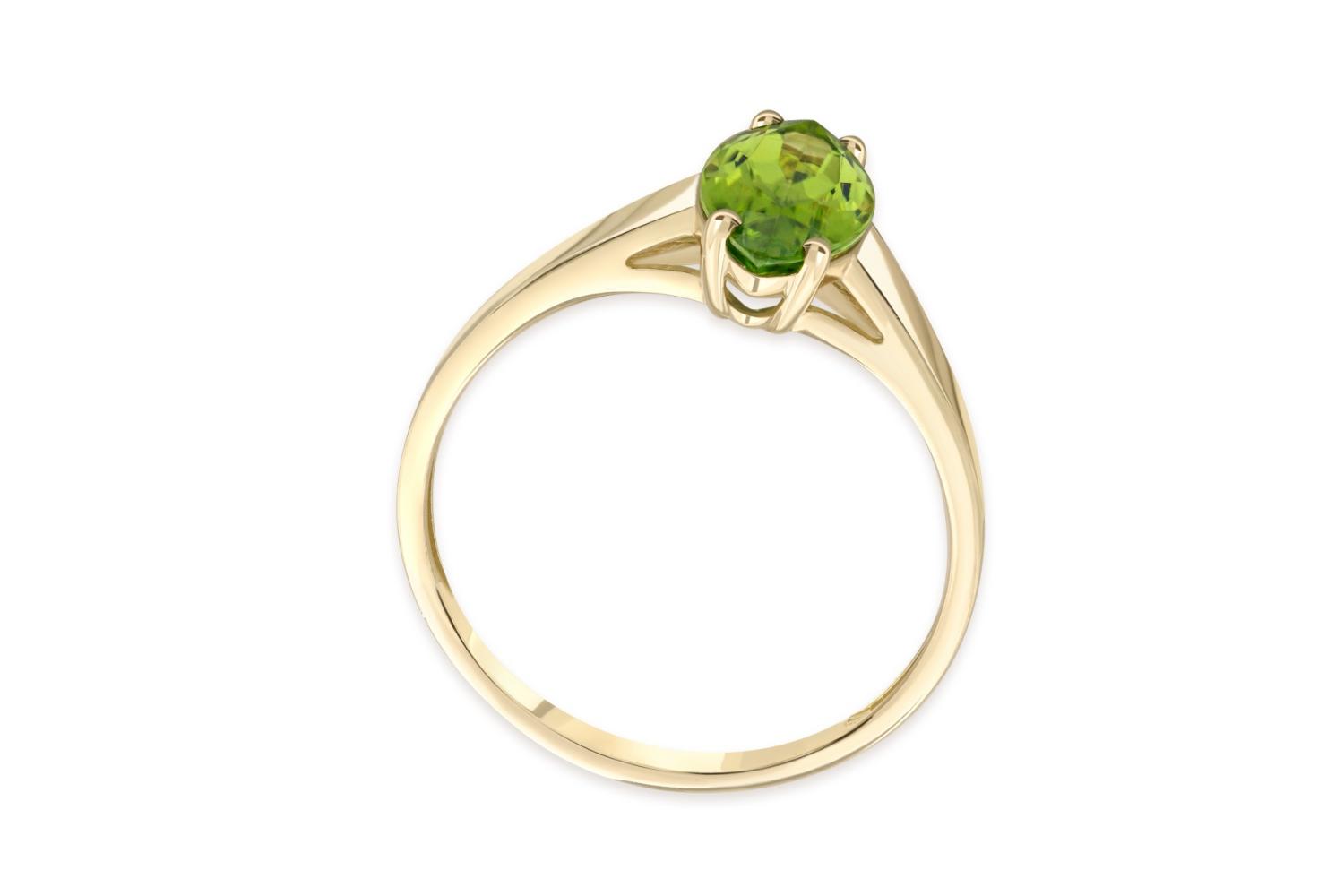 Изящное кольцо, выполненное из желтого золота 585 пробы, украшено великолепным хризолитом огранки маркиз. Камень - насыщенного оливково-зеленого оттенка, с характерным блеском и прозрачностью, что подчеркивает его природное благородство.