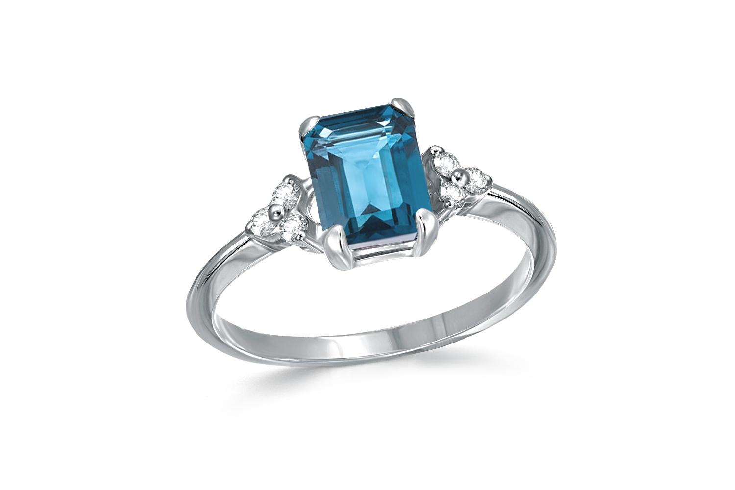 Мастера компании NEWGOLD, приложив всё свое мастерство и искусство, создали для Вас на нашем собственном производстве Кольцо из белого золота с топазом лондон и 6 фианитами.