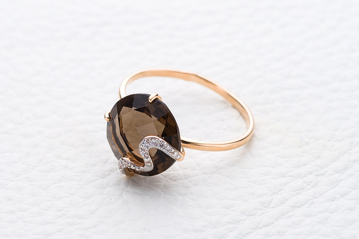 Мастера компании NEWGOLD, приложив всё свое мастерство и искусство, создали для Вас на нашем собственном производстве Кольцо из красного золота с раухтопазом и 7 фианитами.