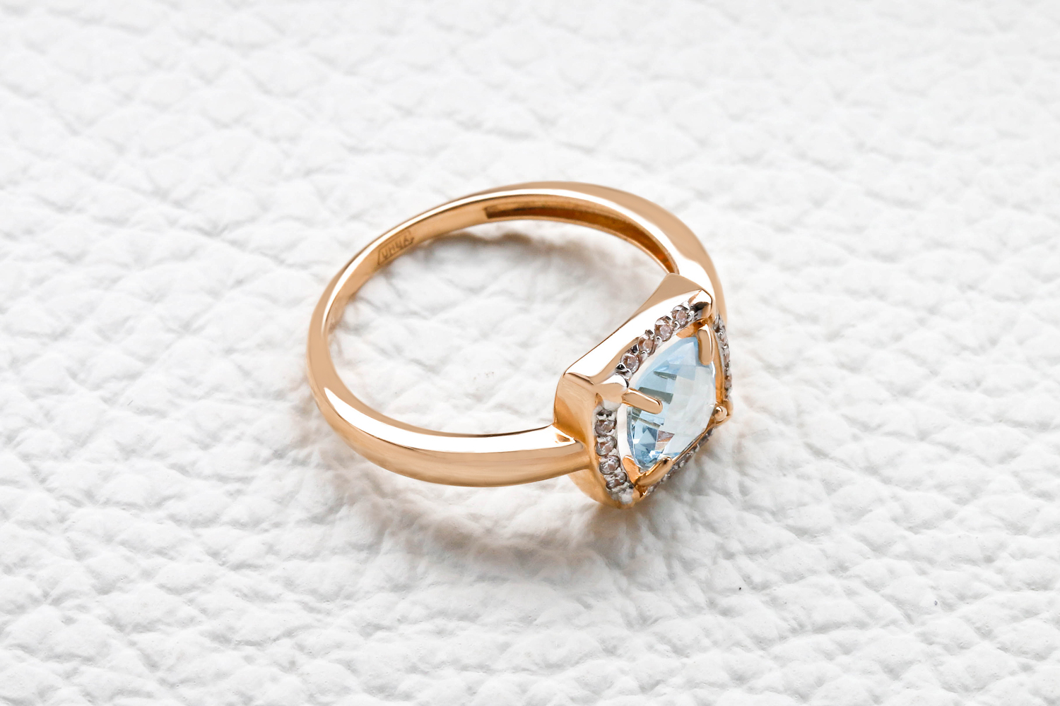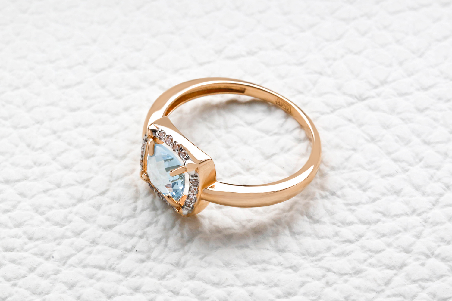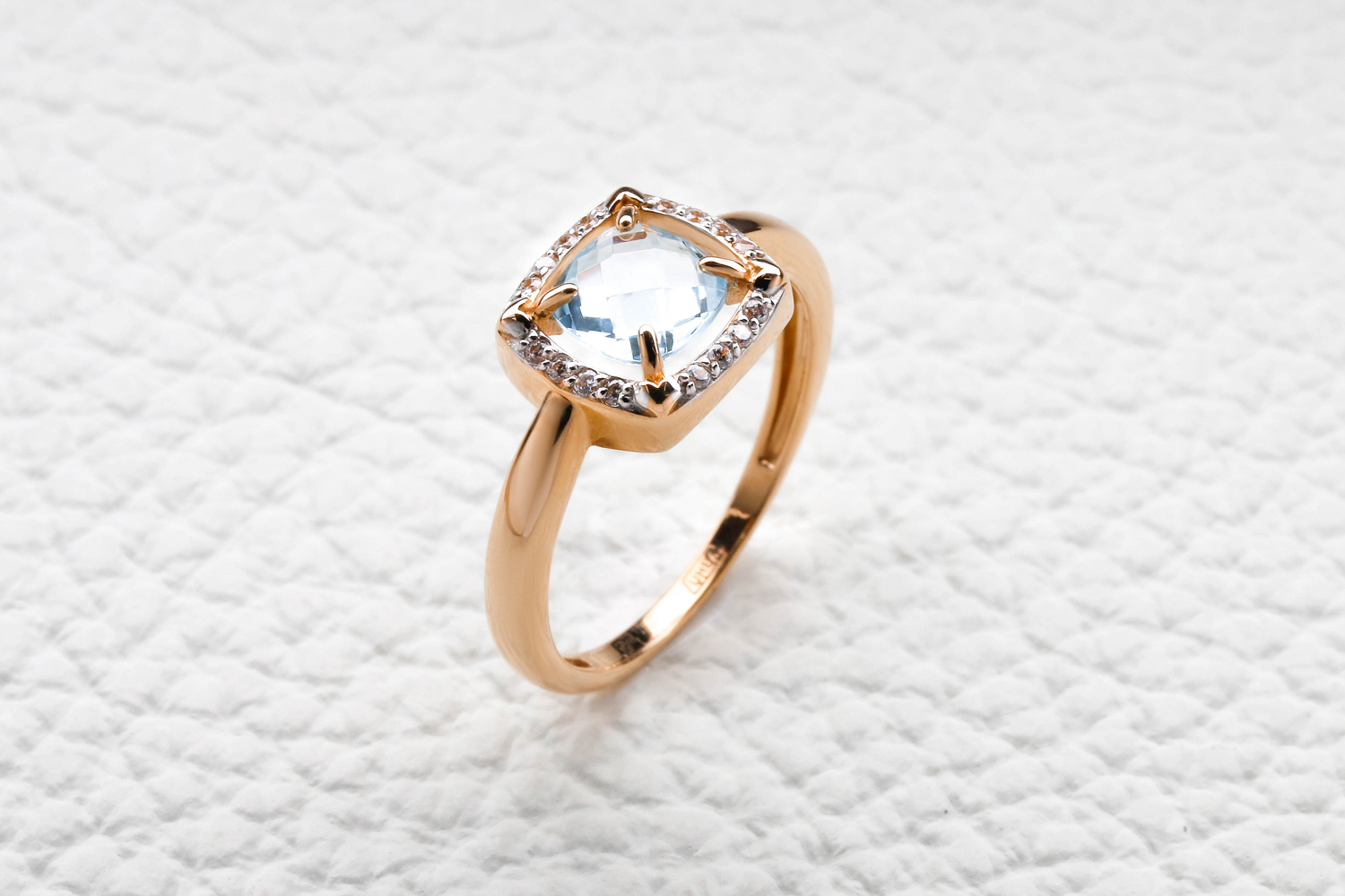 Мастера компании NEWGOLD, приложив всё свое мастерство и искусство, создали для Вас на нашем собственном производстве Кольцо из красного золота с топазом sky и 16 фианитами.