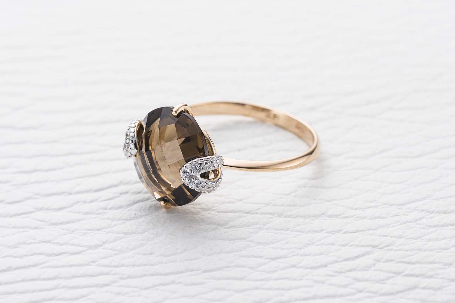 Мастера компании NEWGOLD, приложив всё свое мастерство и искусство, создали для Вас на нашем собственном производстве Кольцо из красного золота с раухтопазом и 6 фианитами.