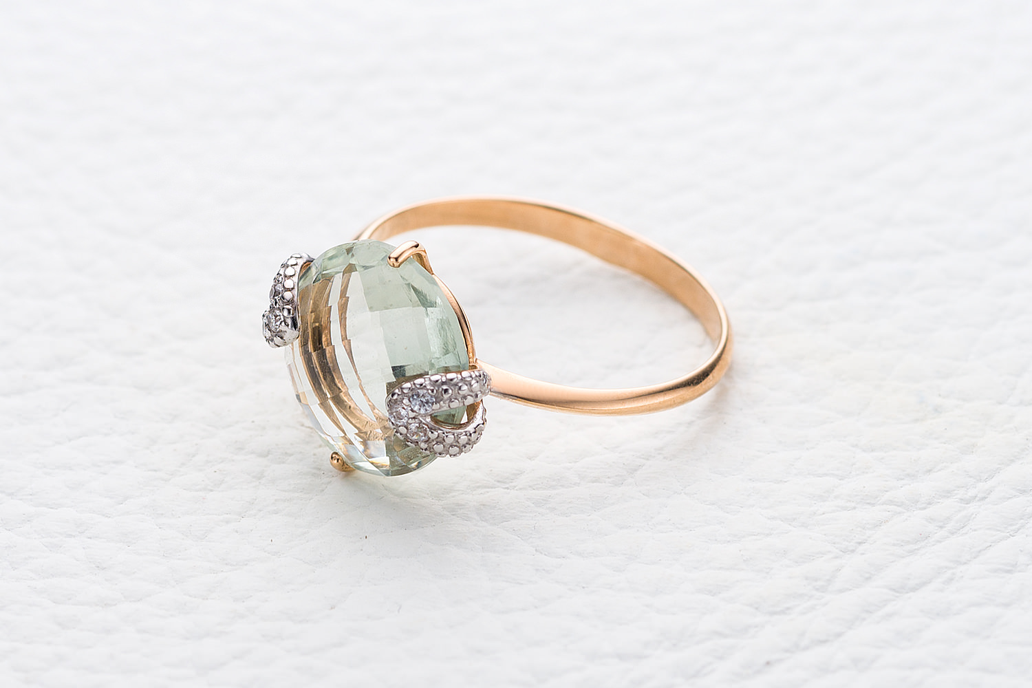 Аметист зеленый натуральный, количество 1 шт., огранка круг-бриолет, размер 12 мм ; Фианит б/цв, количество 6 шт., огранка круг, размер 1,25 мм