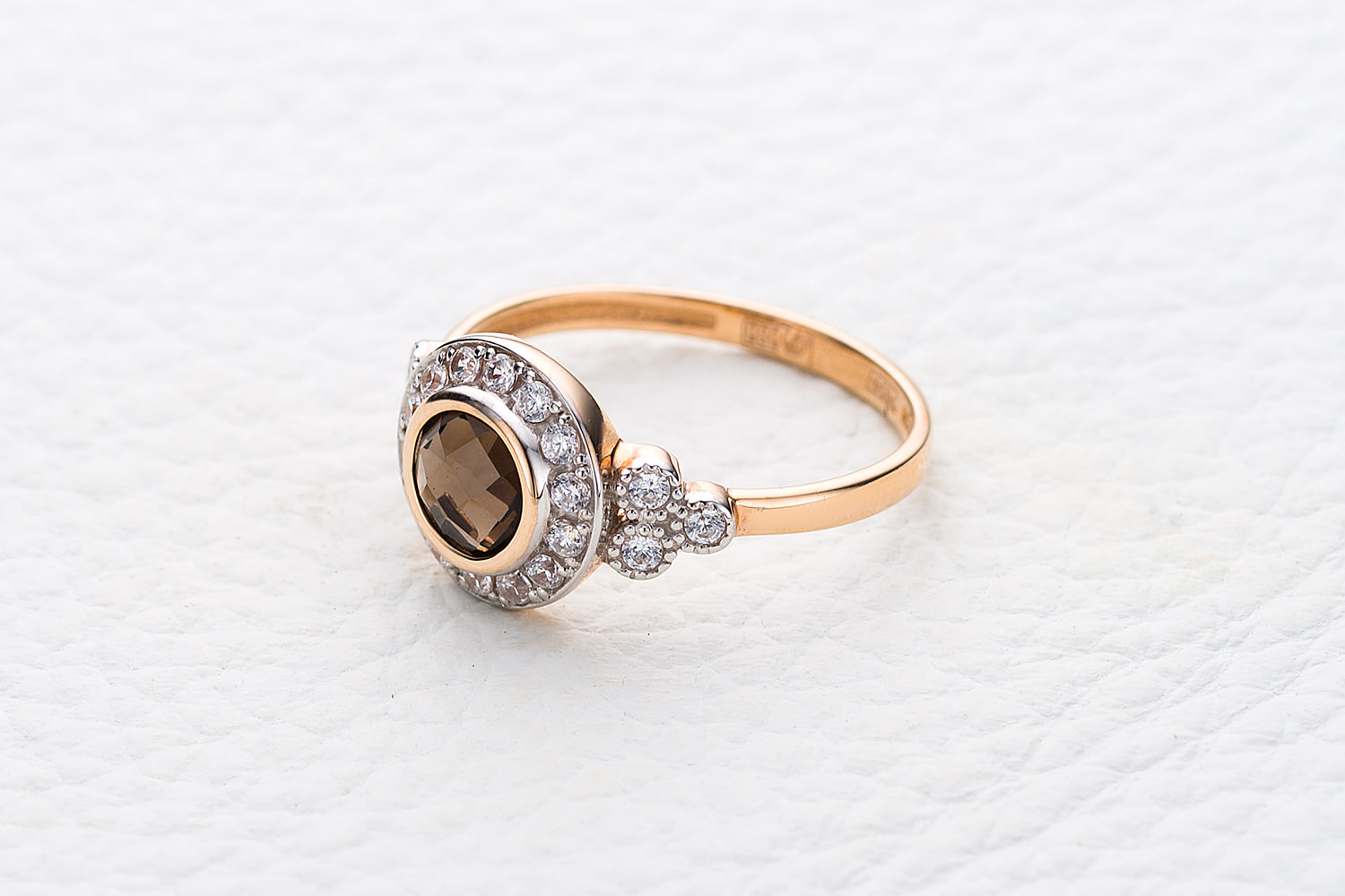 Мастера компании NEWGOLD, приложив всё свое мастерство и искусство, создали для Вас на нашем собственном производстве Кольцо из красного золота с раухтопазом и 20 фианитами.