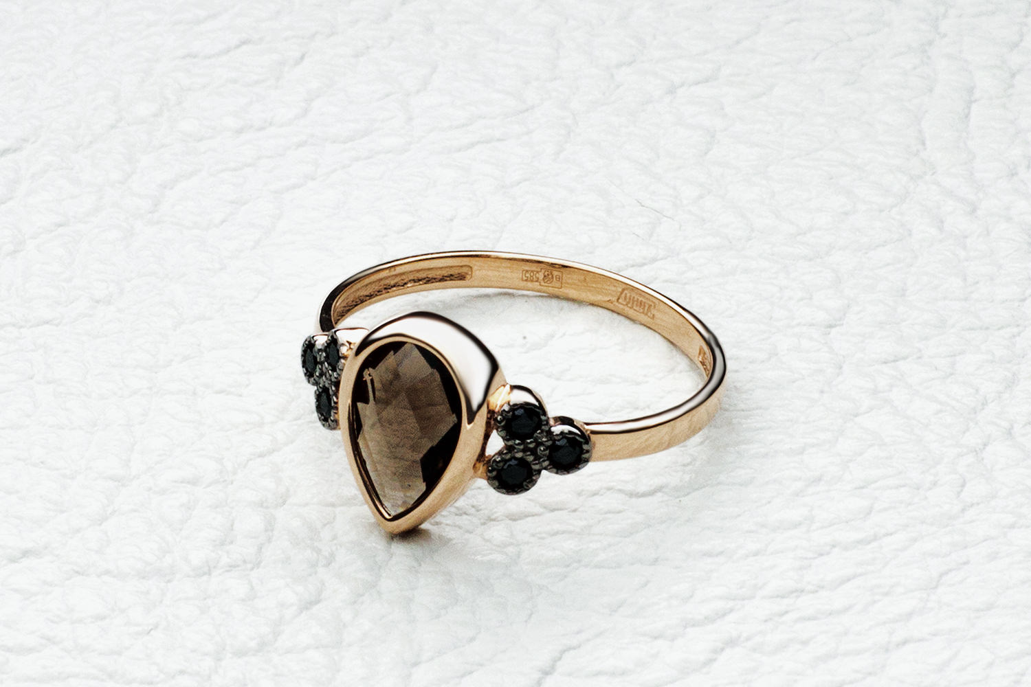 Мастера компании NEWGOLD, приложив всё свое мастерство и искусство, создали для Вас на нашем собственном производстве Кольцо из красного золота с раухтопазом и 6 фианитами.
