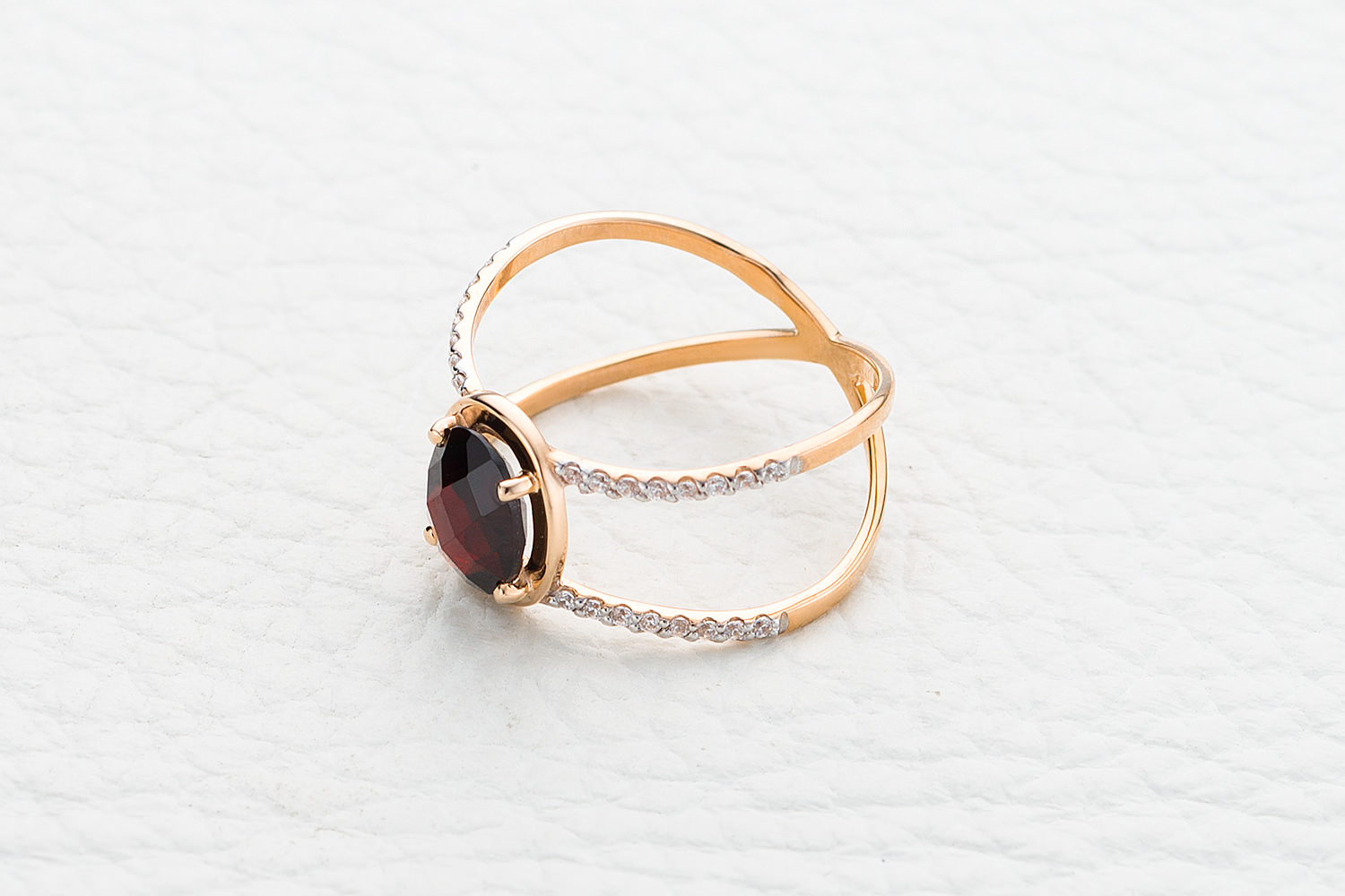 Мастера компании NEWGOLD, приложив всё свое мастерство и искусство, создали для Вас на нашем собственном производстве Кольцо из красного золота с гранатом и 32 фианитами.