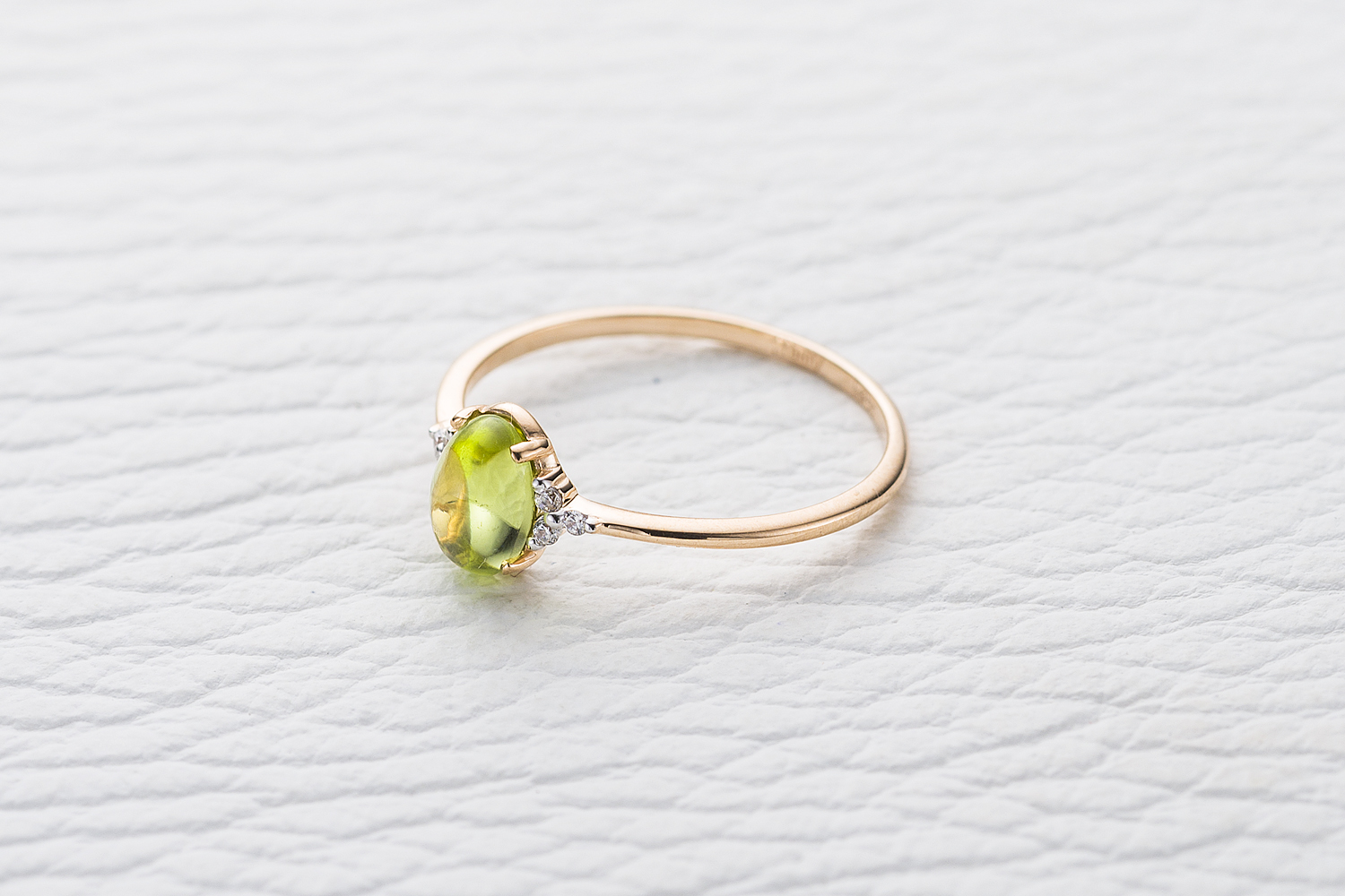 Мастера компании NEWGOLD, приложив всё свое мастерство и искусство, создали для Вас на нашем собственном производстве Кольцо из красного золота с хризолитом и 6 фианитами.