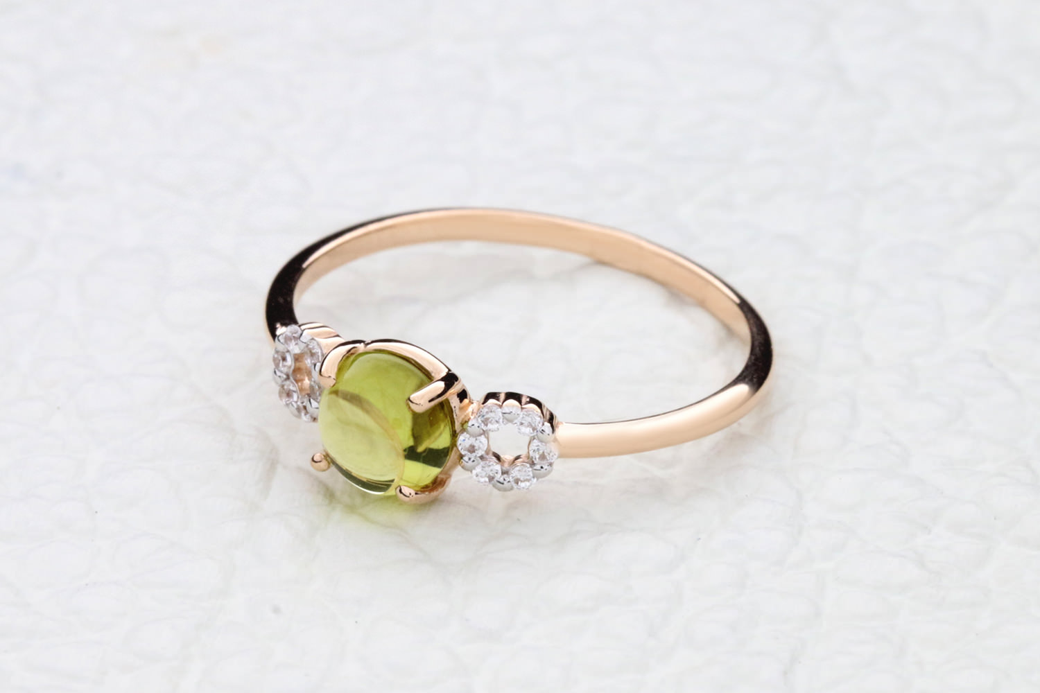 Мастера компании NEWGOLD, приложив всё свое мастерство и искусство, создали для Вас на нашем собственном производстве Кольцо из красного золота с хризолитом и 12 фианитами.