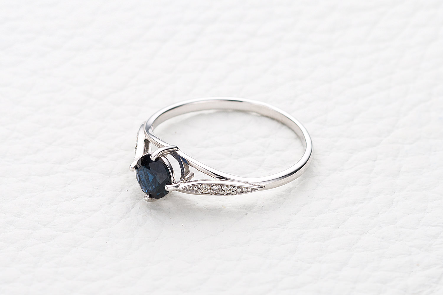 Сапфир натуральный, количество 1 шт., огранка круг, размер 5 мм, цвет 2, чистота 2, вес 0,85 карат. ; Бриллиант, количество 6 шт., огранка Кр-57, размер 1 мм, цвет 4, чистота 5, вес 0,024 карат.