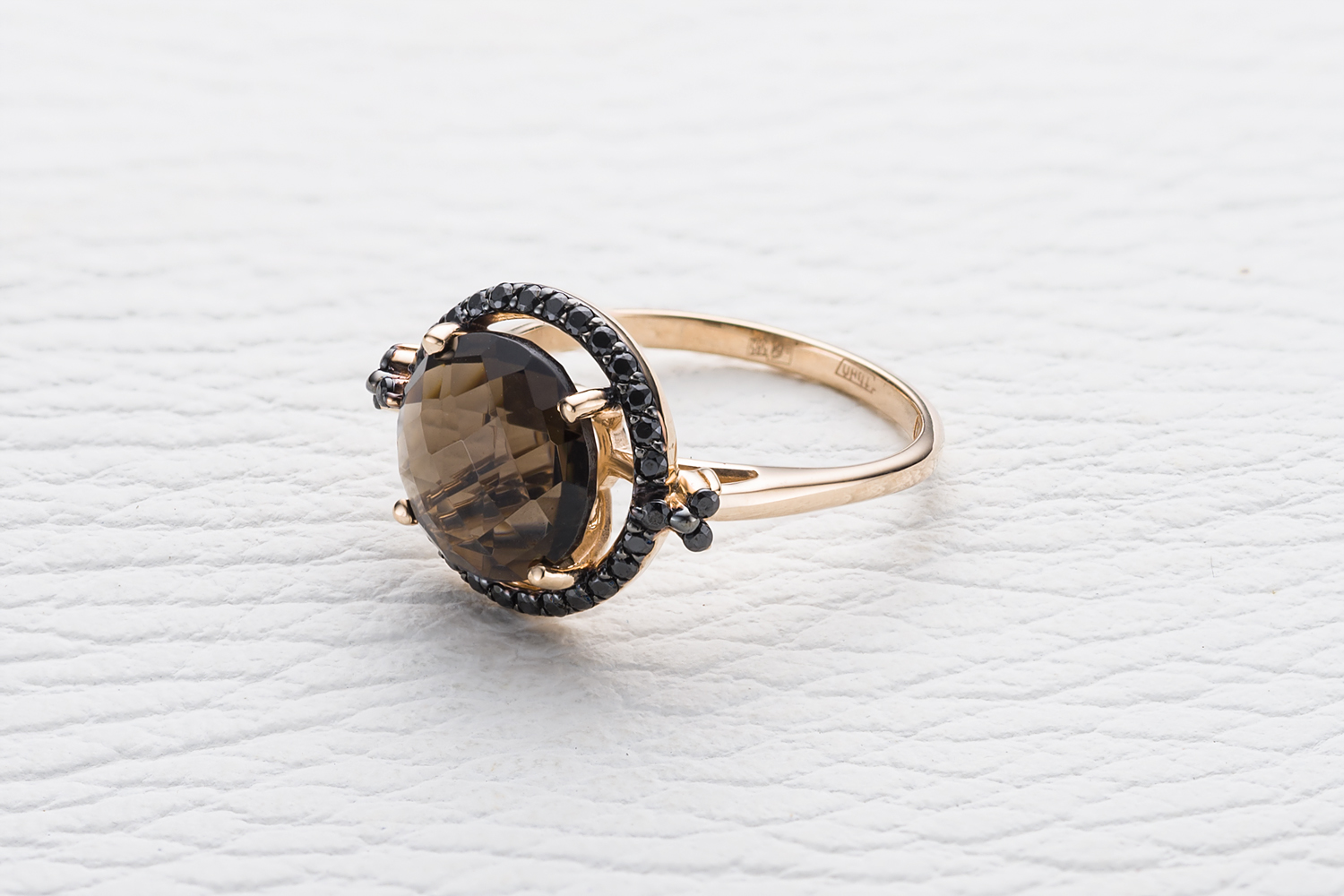 Мастера компании NEWGOLD, приложив всё свое мастерство и искусство, создали для Вас на нашем собственном производстве Кольцо из красного золота с раухтопазом и 32 фианитами.