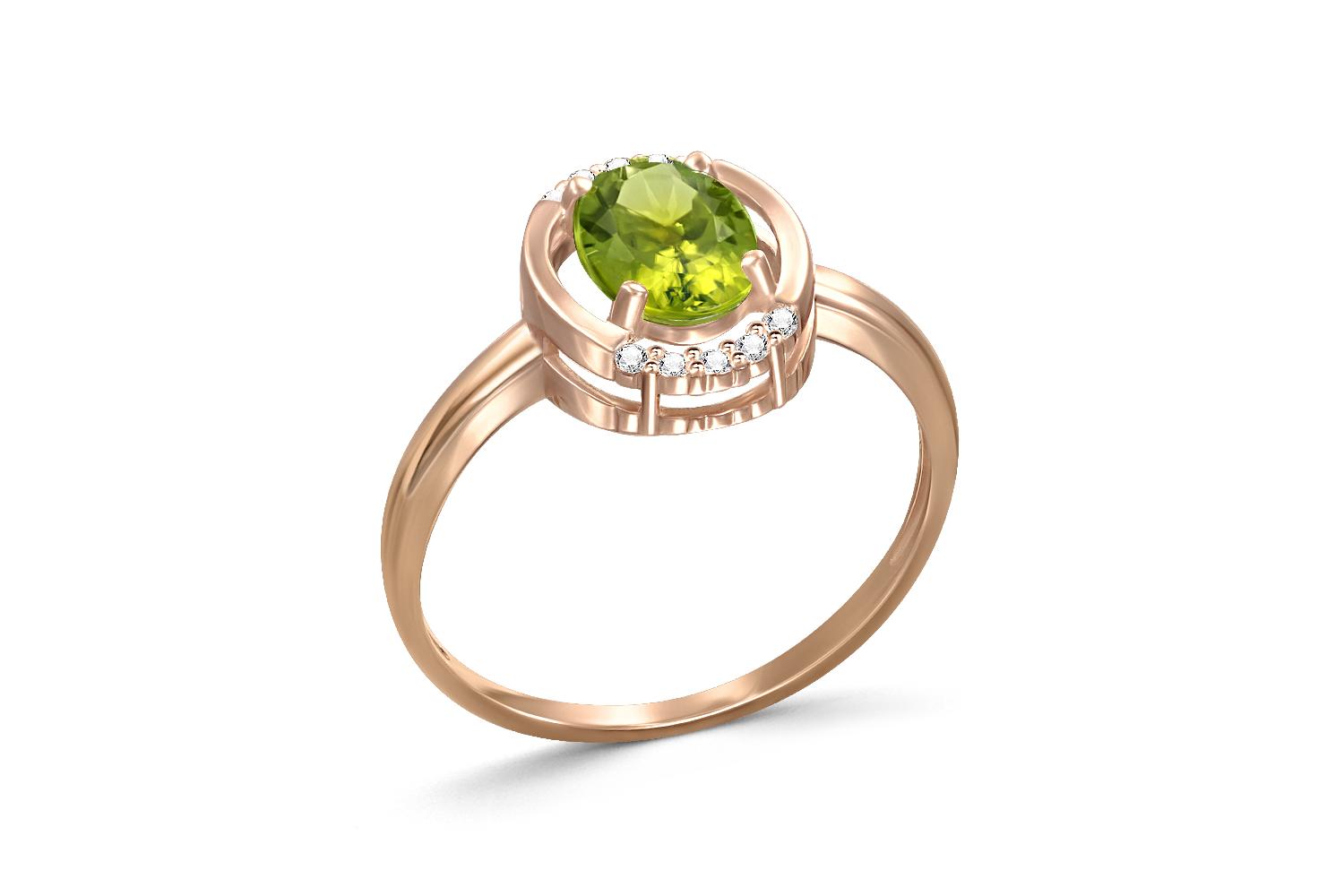 Мастера компании NEWGOLD, приложив всё свое мастерство и искусство, создали для Вас на нашем собственном производстве Кольцо из красного золота с хризолитом и 10 фианитами.