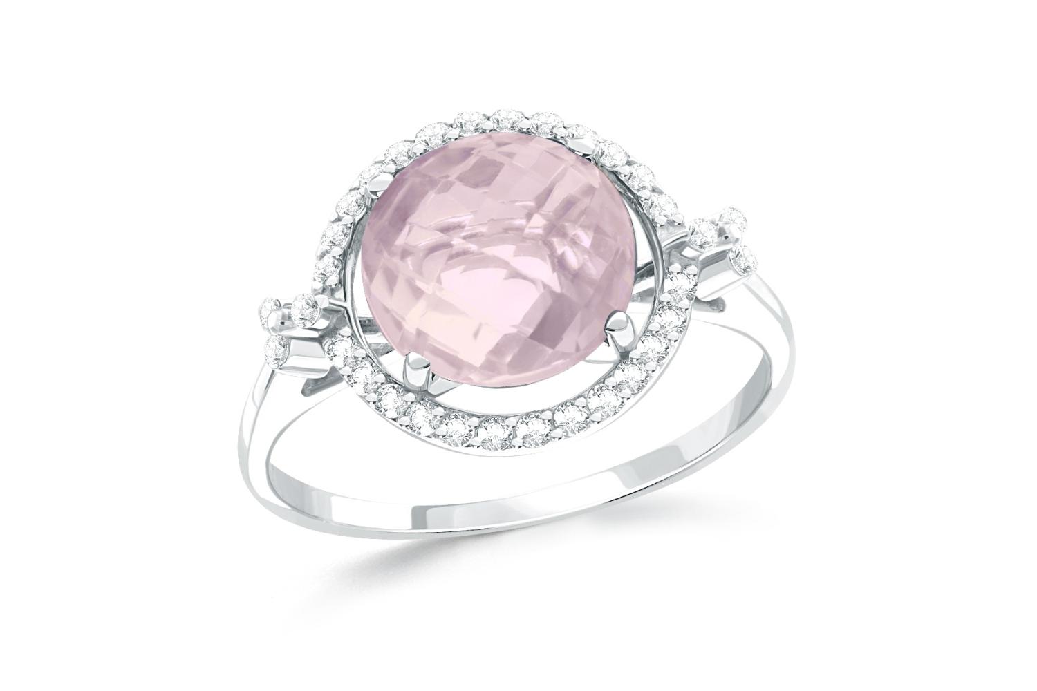 Кварц Розовый натуральный, количество 1 шт., огранка круг-бриолет, размер 10 мм ; Фианит б/цв, количество 32 шт., огранка круг, размер 1,25 мм