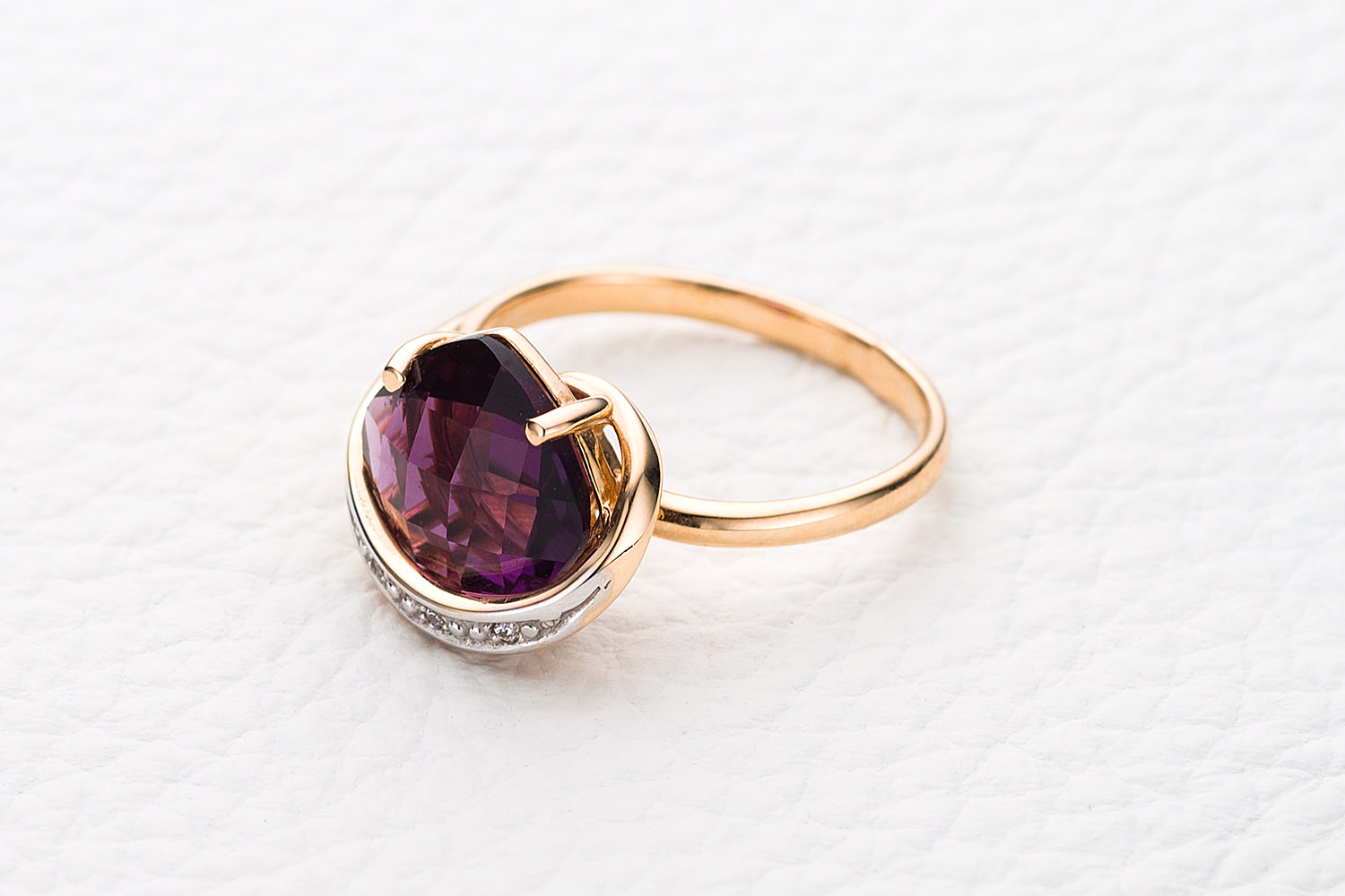 Мастера компании NEWGOLD, приложив всё свое мастерство и искусство, создали для Вас на нашем собственном производстве Кольцо из красного золота с аметистом и 3 фианитами.