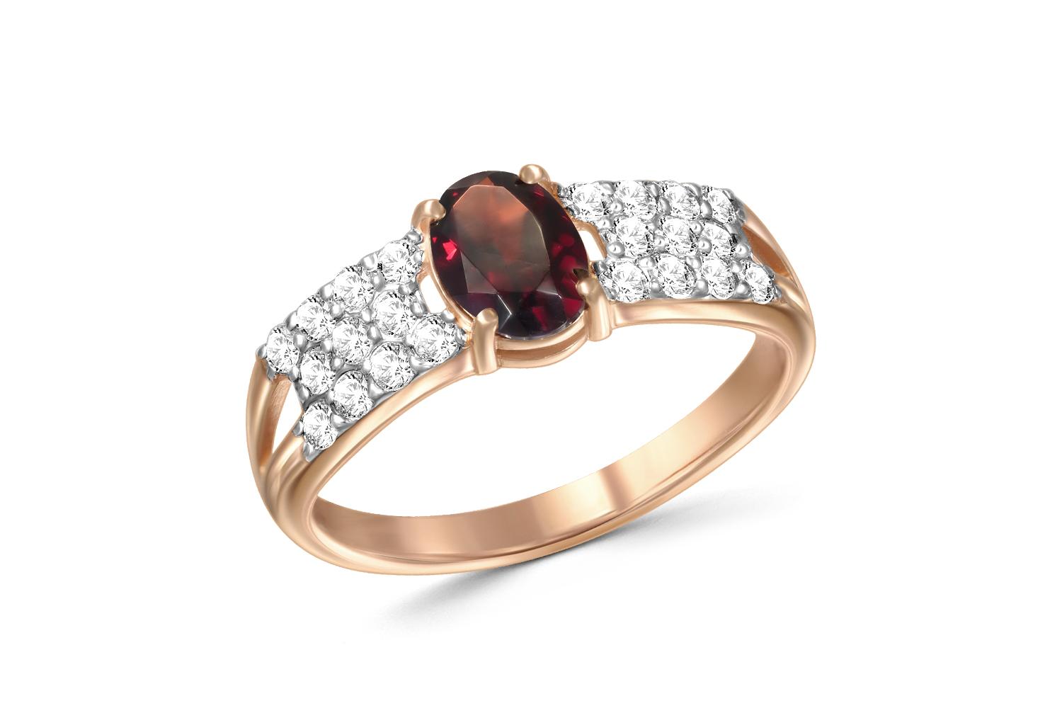 Мастера компании NEWGOLD, приложив всё свое мастерство и искусство, создали для Вас на нашем собственном производстве Кольцо из красного золота с гранатом и 22 фианитами.