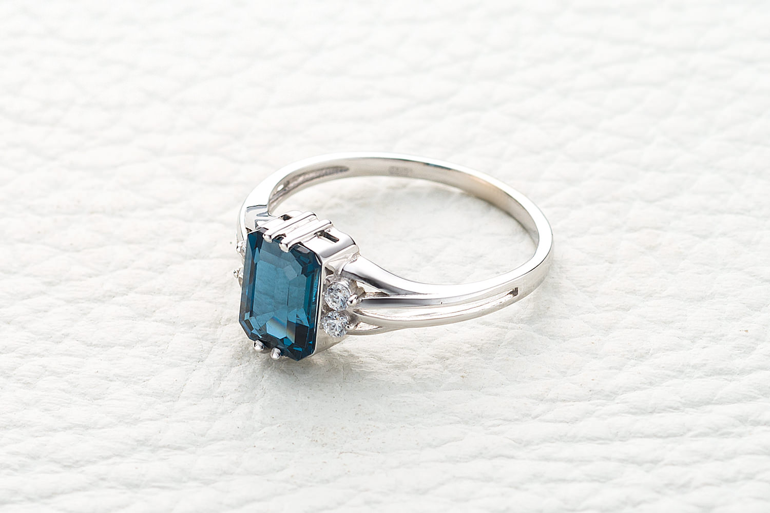 Топаз лондон натуральный, количество 1 шт., огранка октагон, размер 8ˣ6 ; Фианит б/цв, количество 4 шт., огранка круг, размер 1,75 мм