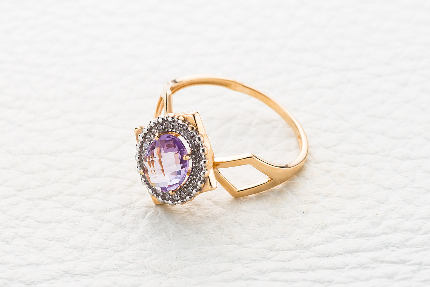 Мастера компании NEWGOLD, приложив всё свое мастерство и искусство, создали для Вас на нашем собственном производстве Кольцо из красного золота с аметистом и 22 фианитами.