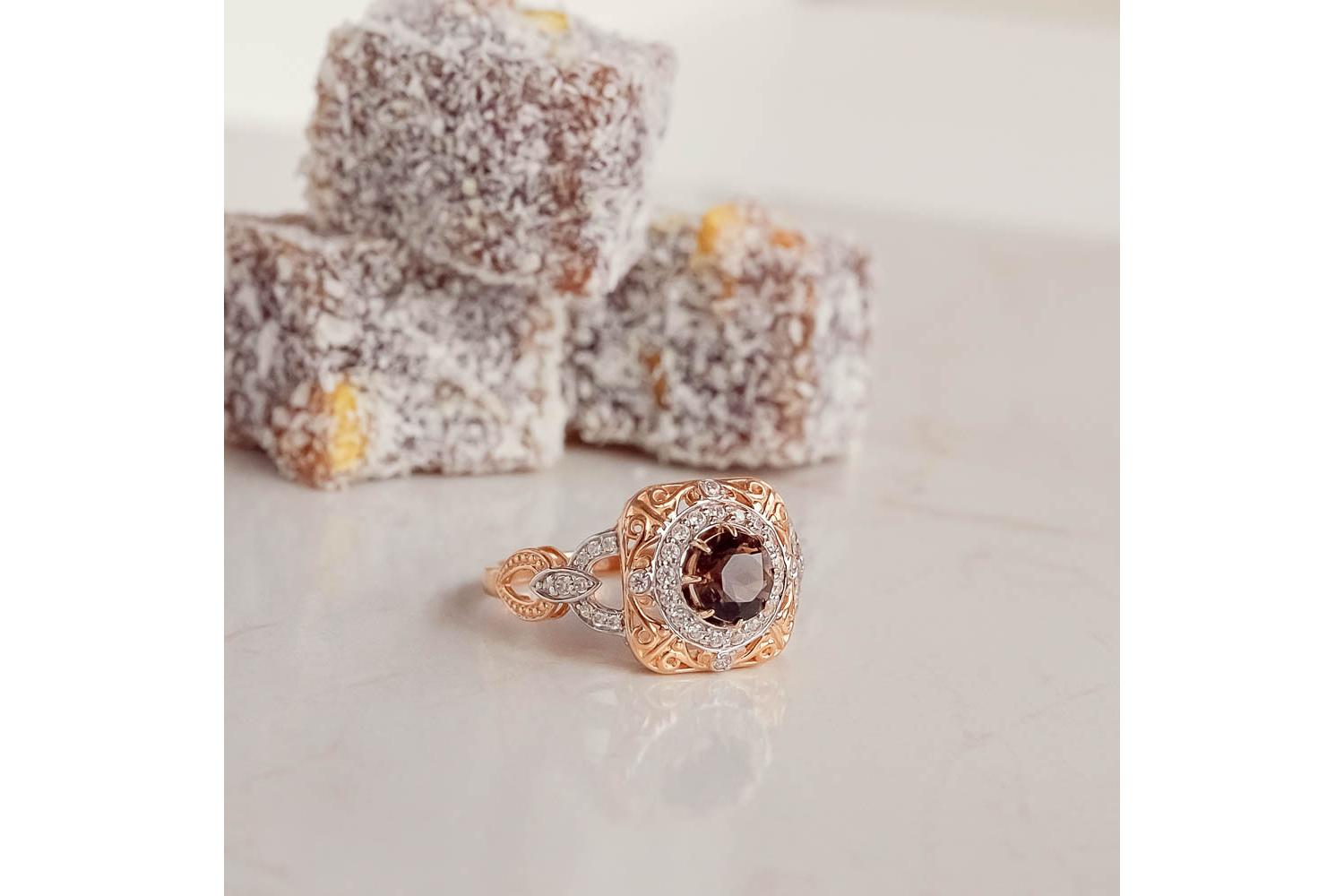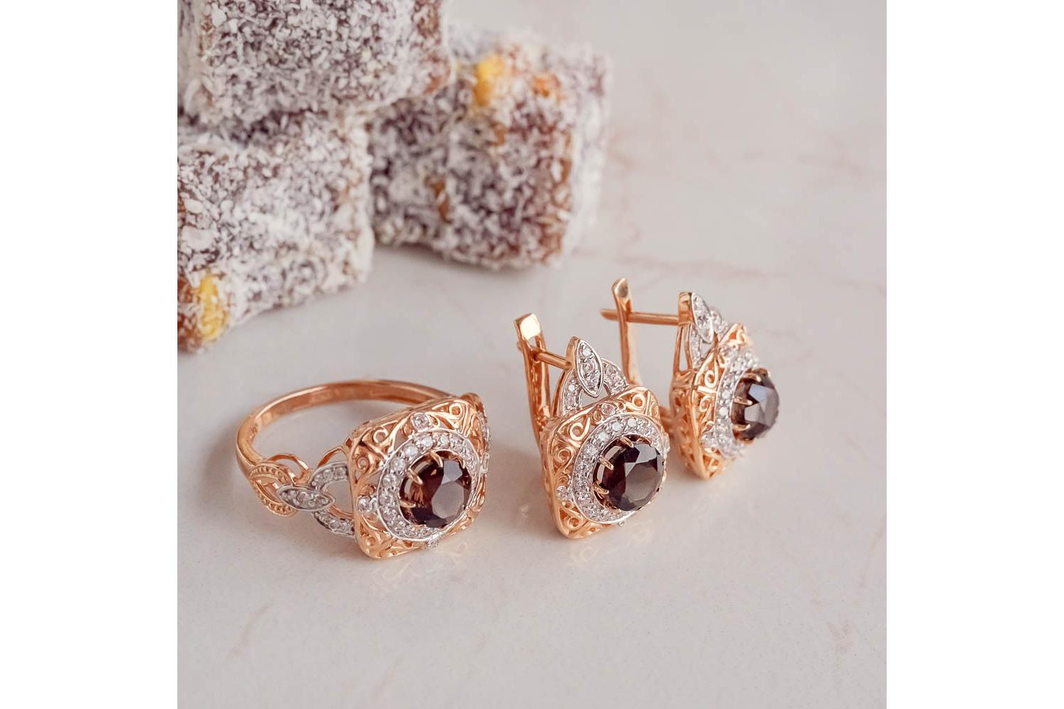 Мастера компании NEWGOLD, приложив всё свое мастерство и искусство, создали для Вас на нашем собственном производстве Кольцо из красного золота с раухтопазом и 39 фианитами.