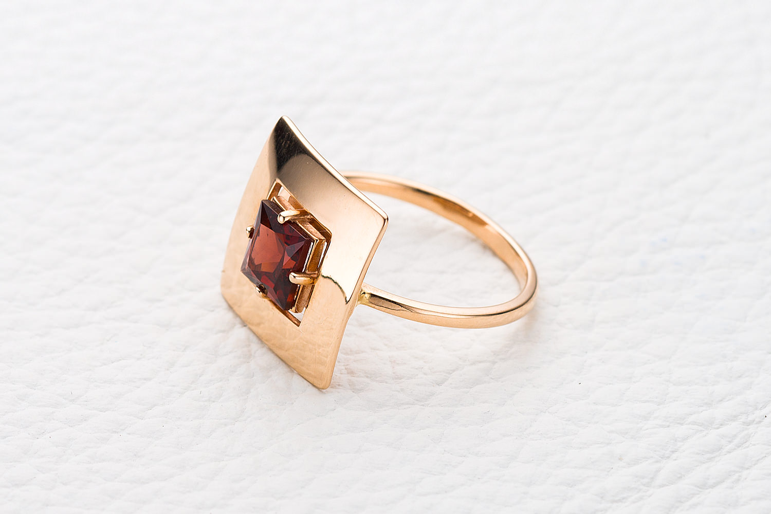 Мастера компании NEWGOLD, приложив всё свое мастерство и искусство, создали для Вас на нашем собственном производстве Кольцо Квадрат из красного золота с гранатом.