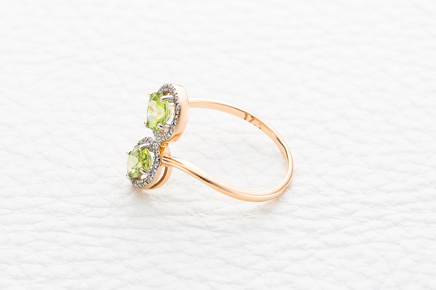 Мастера компании NEWGOLD, приложив всё свое мастерство и искусство, создали для Вас на нашем собственном производстве Кольцо из красного золота с 2 хризолитами и 32 фианитами.