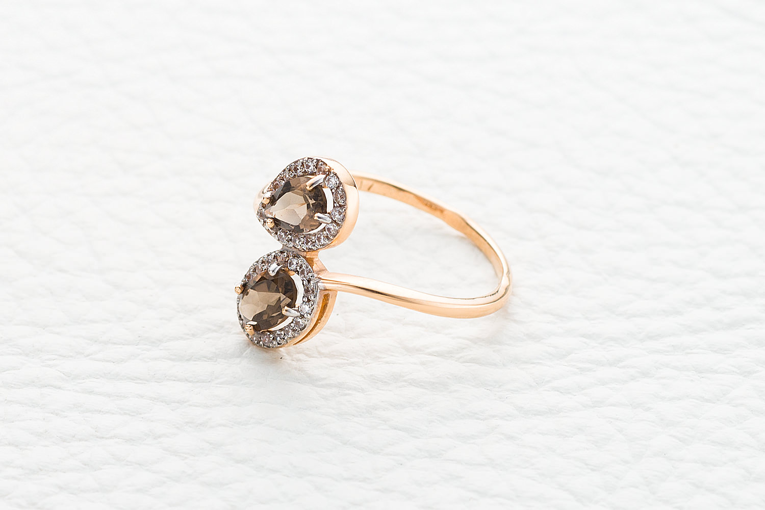 Мастера компании NEWGOLD, приложив всё свое мастерство и искусство, создали для Вас на нашем собственном производстве Кольцо из красного золота с 2 раухтопазами и 32 фианитами.