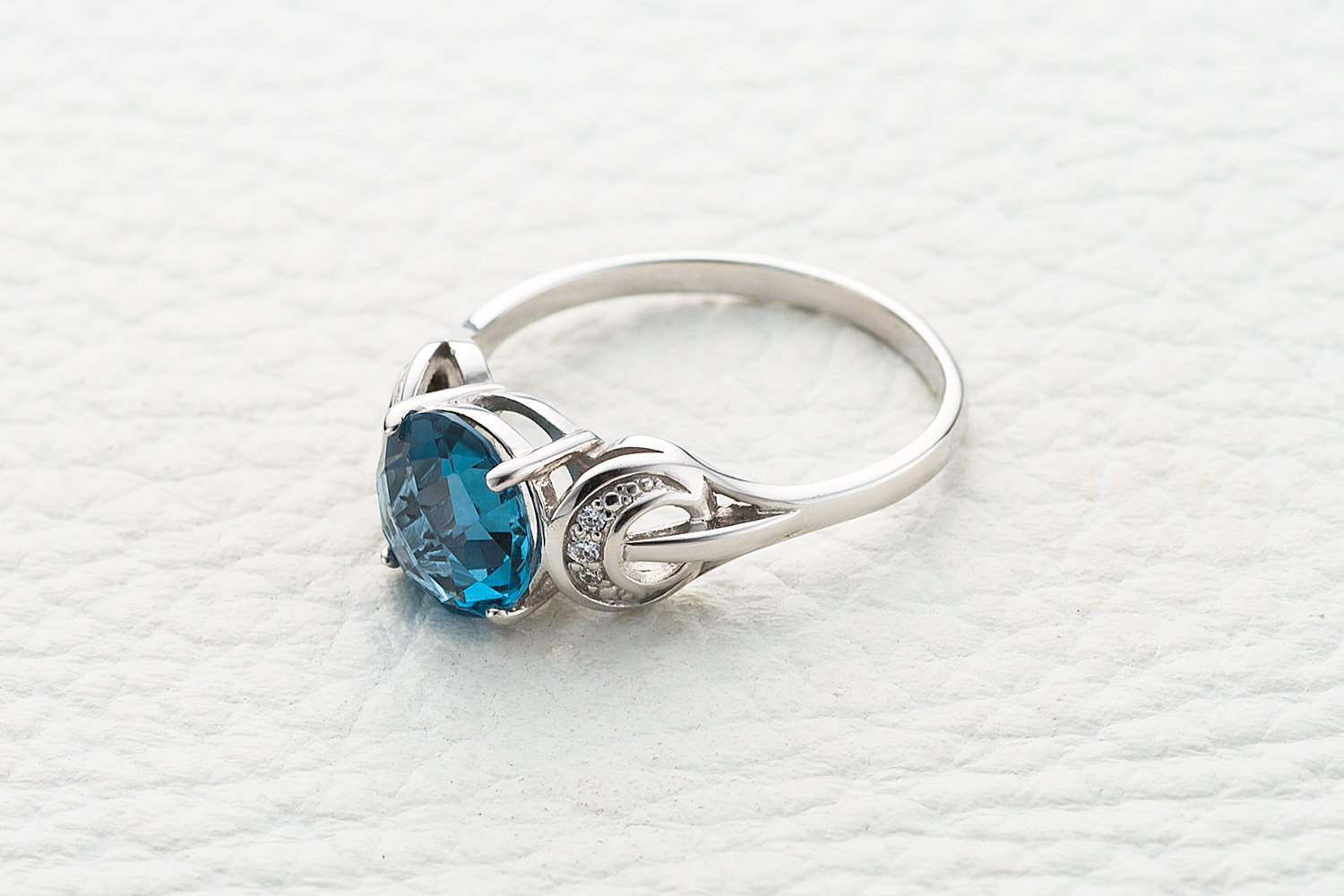 Мастера компании NEWGOLD, приложив всё свое мастерство и искусство, создали для Вас на нашем собственном производстве Кольцо из белого золота с топазом лондон и 6 фианитами.