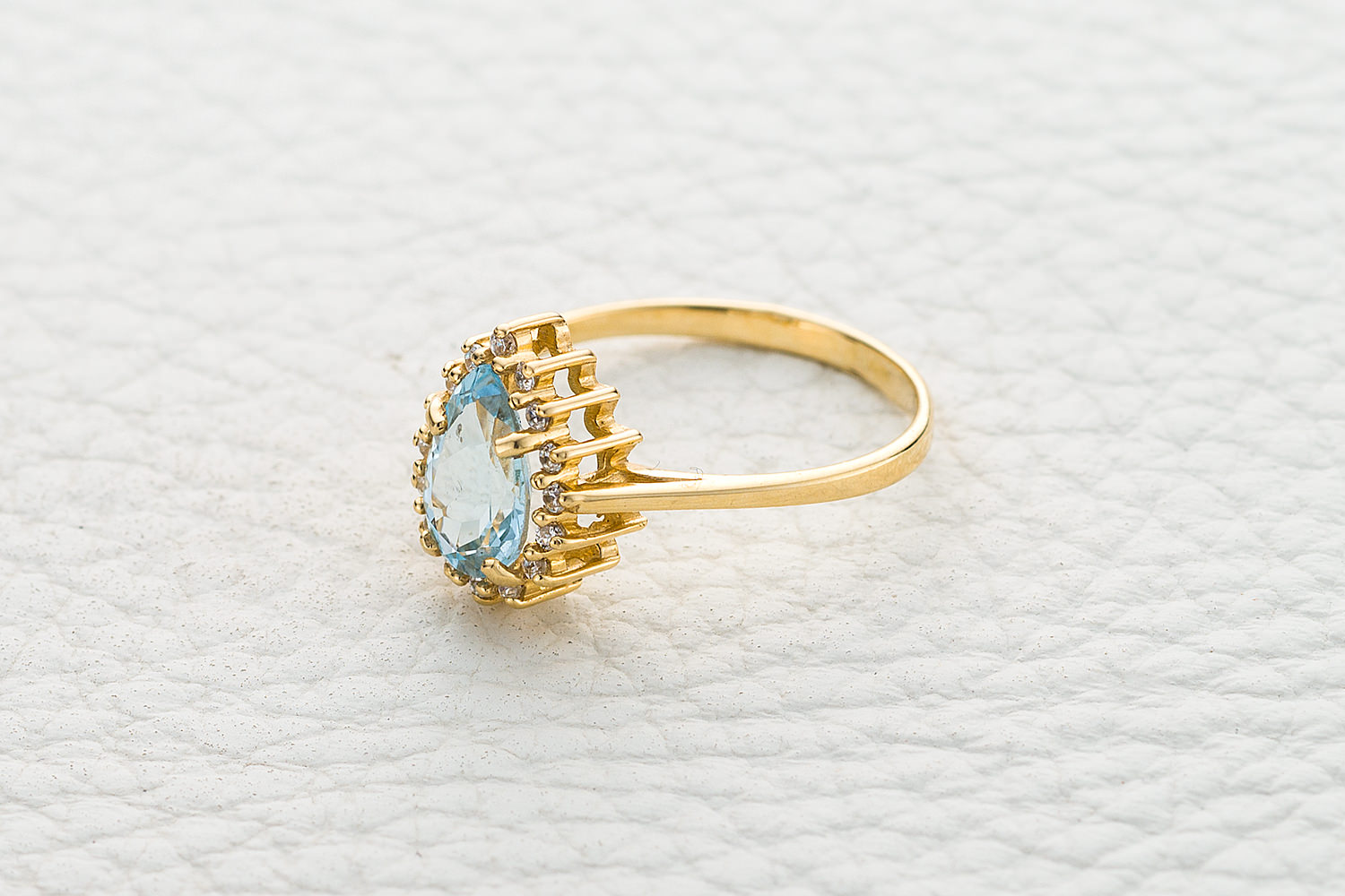 Мастера компании NEWGOLD, приложив всё свое мастерство и искусство, создали для Вас на нашем собственном производстве Кольцо из жёлтого золота с топазом sky и 16 фианитами.