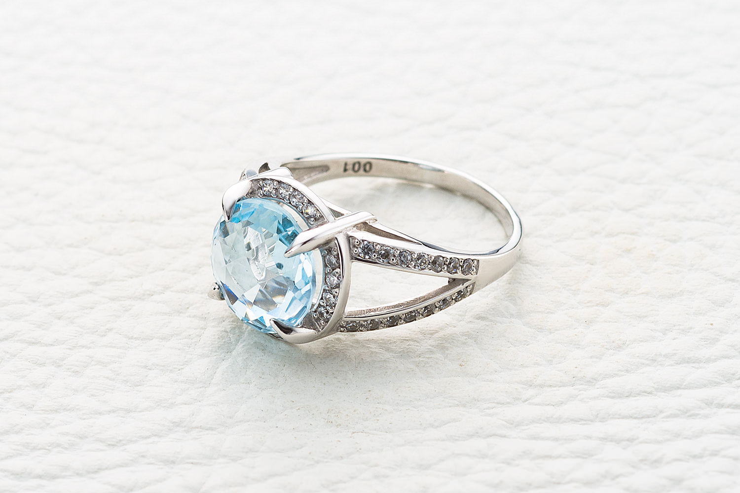 Мастера компании NEWGOLD, приложив всё свое мастерство и искусство, создали для Вас на нашем собственном производстве Кольцо из белого золота с топазом sky и 44 фианитами.