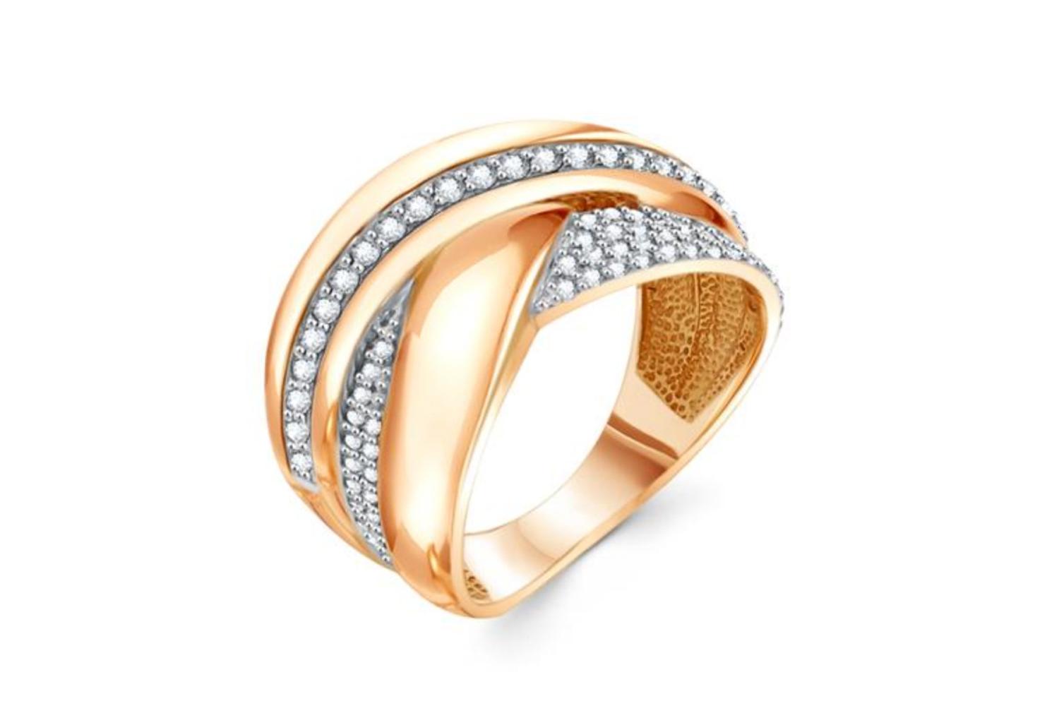 Коллекция: Wave. Металл: Золото, цвет: Красный , проба: 585. Вставки: Фианит б/цв, количество 22 шт. , огранка круг, размер 1,25 мм ; Фианит б/цв, количество 56 шт.