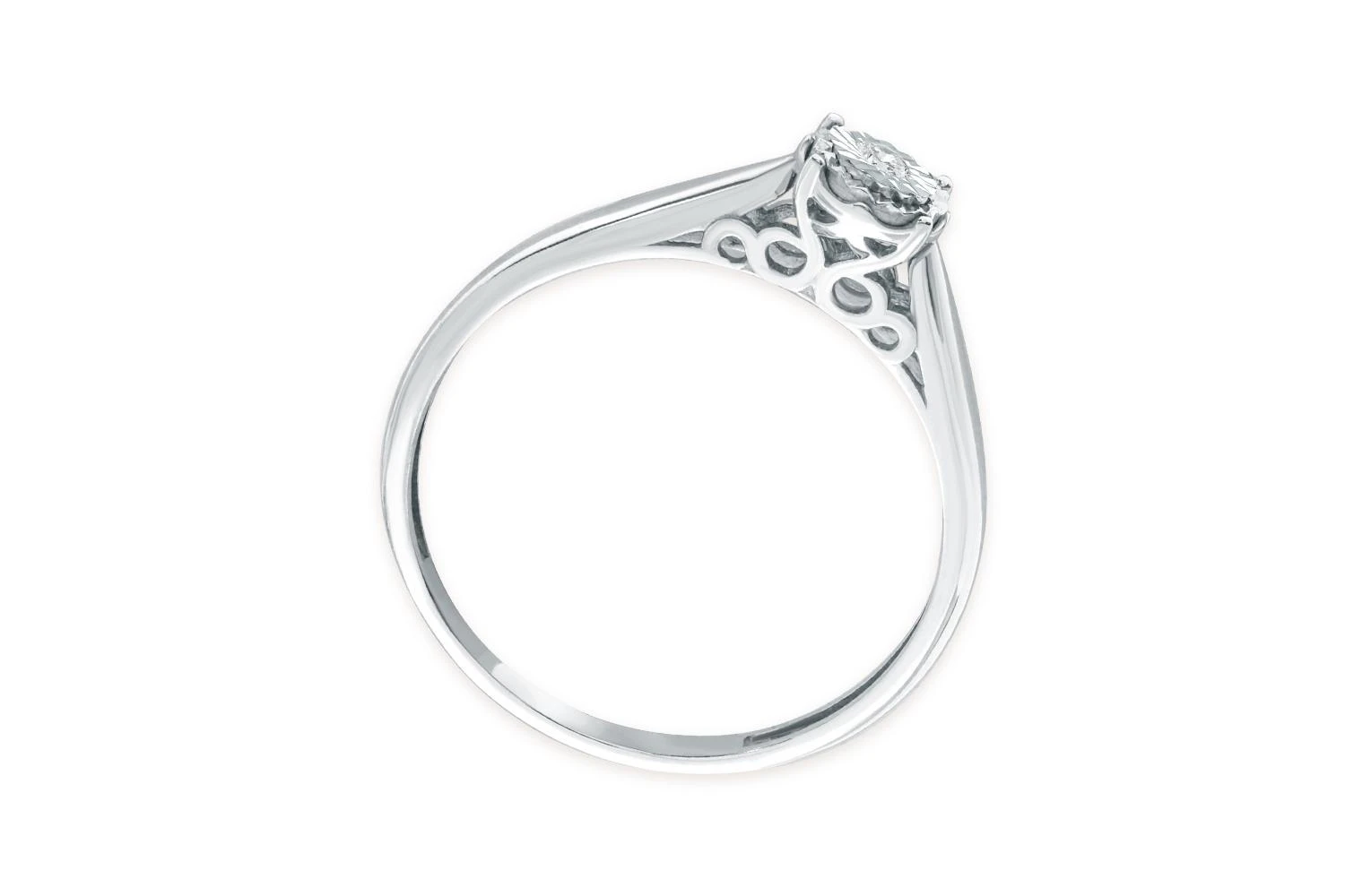 Тонкая изящная шинка плавно изгибается, создавая впечатление легкости и воздушности. Бриллиант посажен в технике "иллюзион", которая визуально увеличивает его размер и играет мельчайшими гранями, улавливая каждый луч света.
