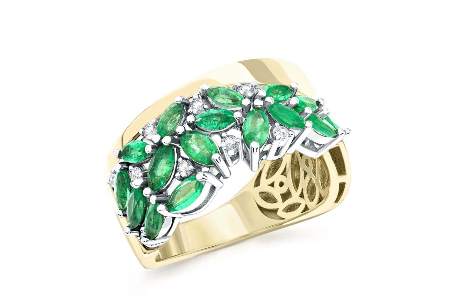 Изумруд натуральный, количество 5 шт., огранка маркиз, размер 5ˣ2,5, цвет 3, чистота Г3, вес 0,563 карат. ; Изумруд натуральный, количество 11 шт., огранка маркиз, размер 4ˣ2, цвет 3, чистота 3, вес 0,767 карат. ; Бриллиант, количество 9 шт., огранка Кр