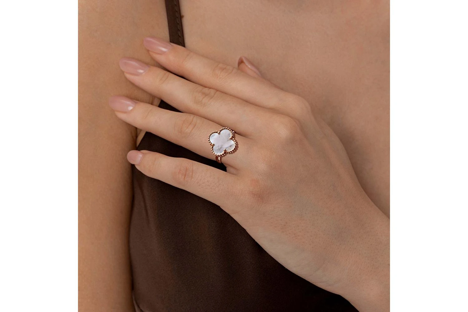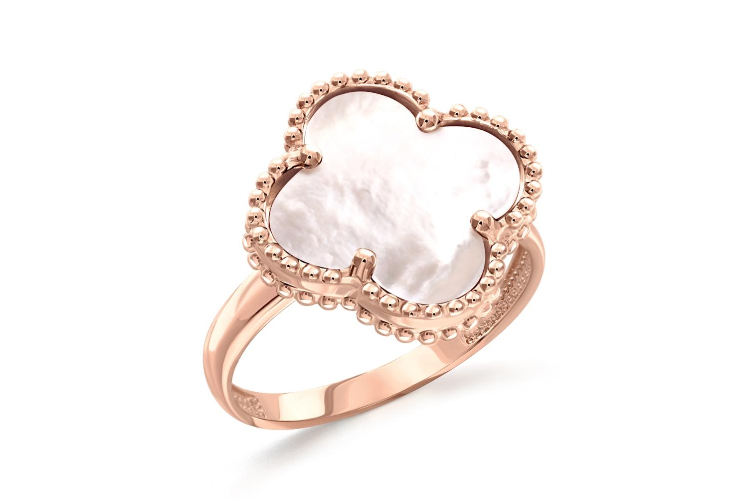 Мастера компании NEWGOLD, приложив всё свое мастерство и искусство, создали для Вас на нашем собственном производстве Кольцо Клевер из красного золота с перламутром.