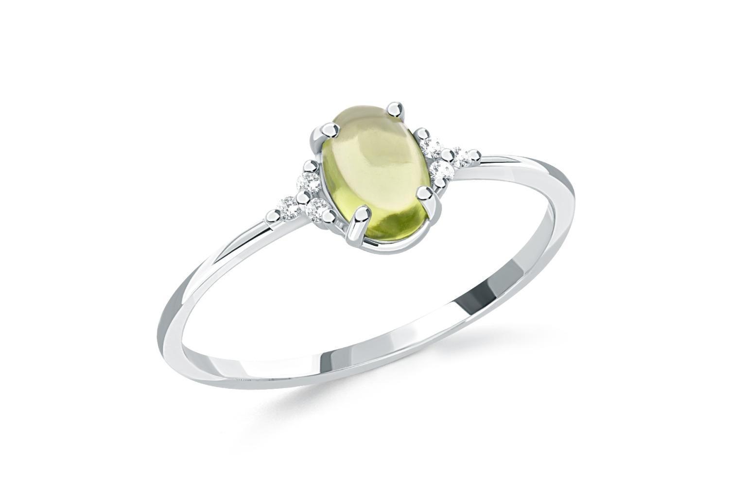 Мастера компании NEWGOLD, приложив всё свое мастерство и искусство, создали для Вас на нашем собственном производстве Кольцо из белого золота с хризолитом и 6 фианитами.