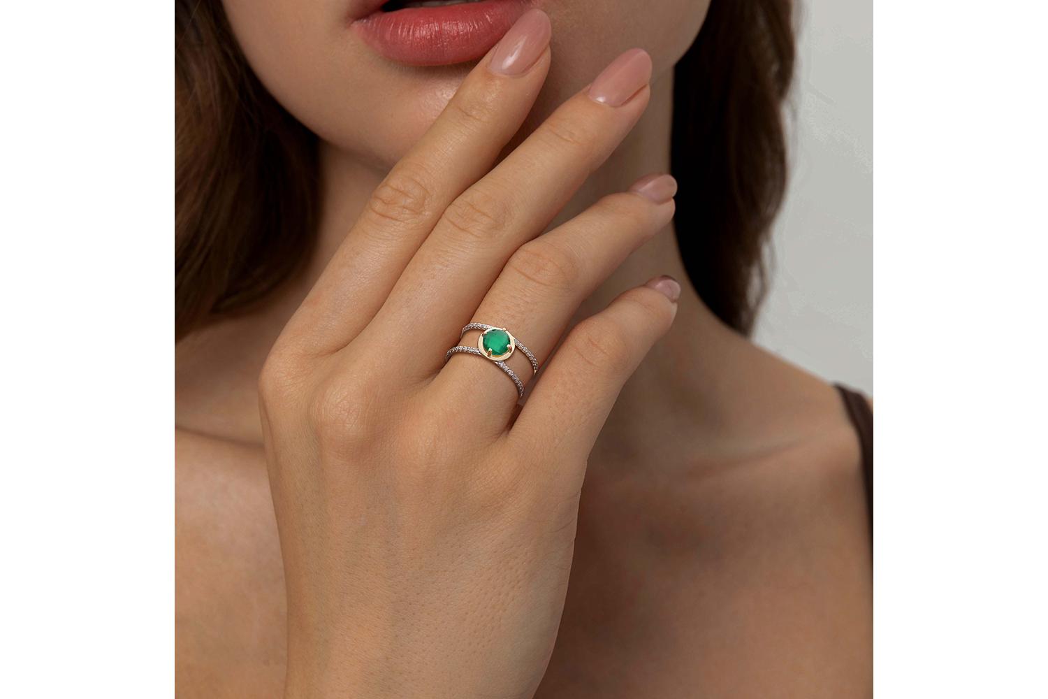 Агат зеленый, количество 1 шт., огранка круг-бриолет, размер 6 мм ; Бриллиант, количество 32 шт., огранка Кр-17, размер 1 мм, цвет 2, чистота 2, вес 0,13 карат.