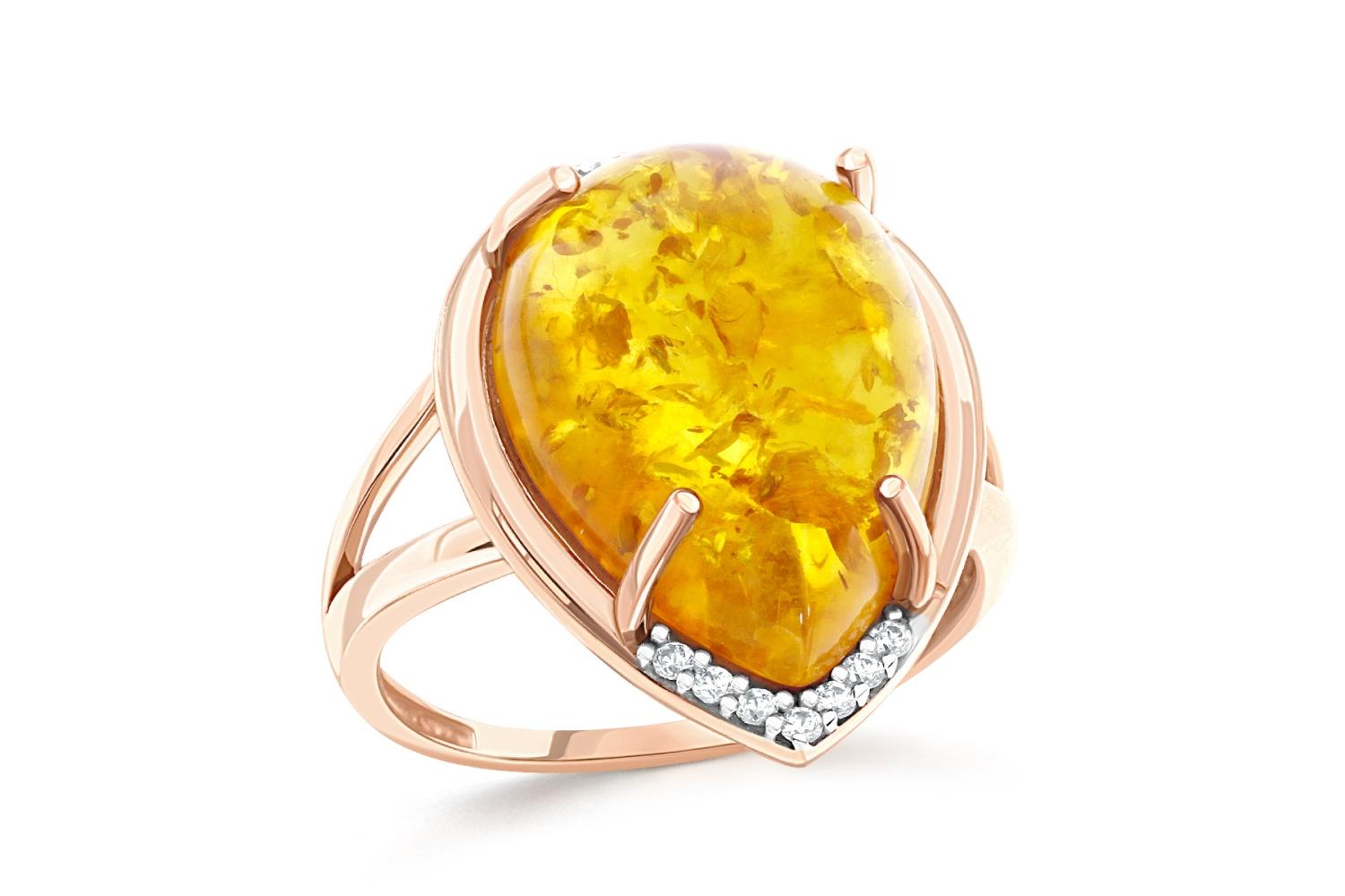 Мастера компании NEWGOLD, приложив всё свое мастерство и искусство, создали для Вас на нашем собственном производстве Кольцо из красного золота с янтарём и 14 фианитами.