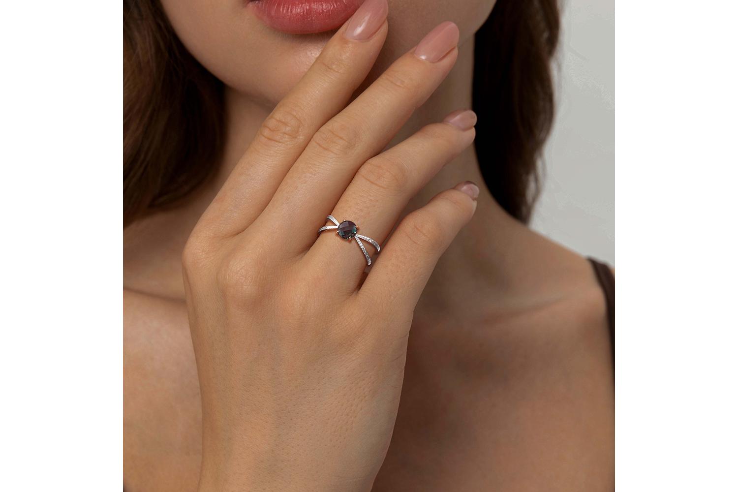 Александрит Гт искусственный, количество 1 шт., огранка круг-бриолет, размер 6 мм ; Бриллиант, количество 28 шт., огранка Кр-17, размер 1 мм, цвет 2, чистота 2, вес 0,114 карат.