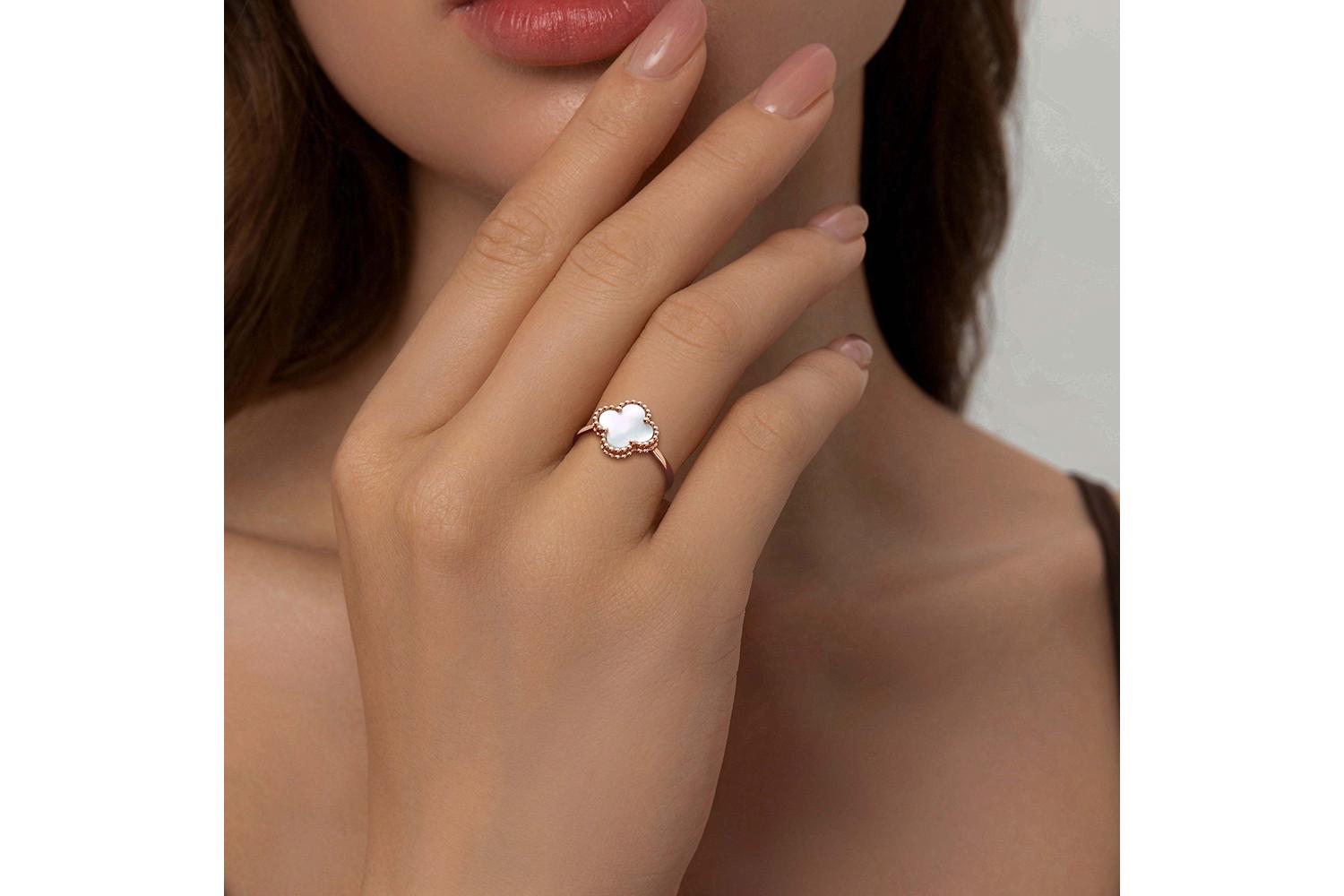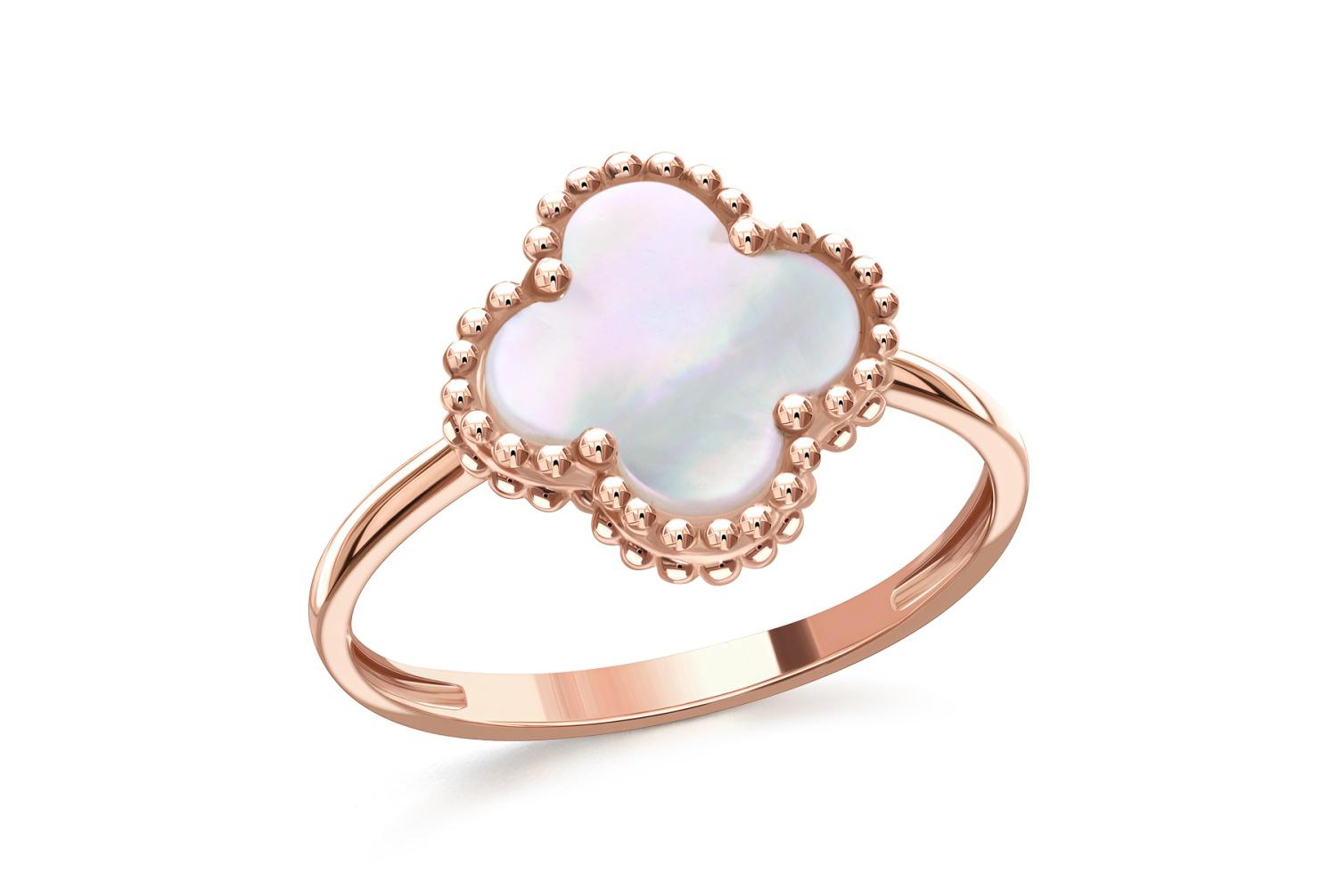 Мастера компании NEWGOLD, приложив всё свое мастерство и искусство, создали для Вас на нашем собственном производстве Кольцо Клевер из красного золота с перламутром.