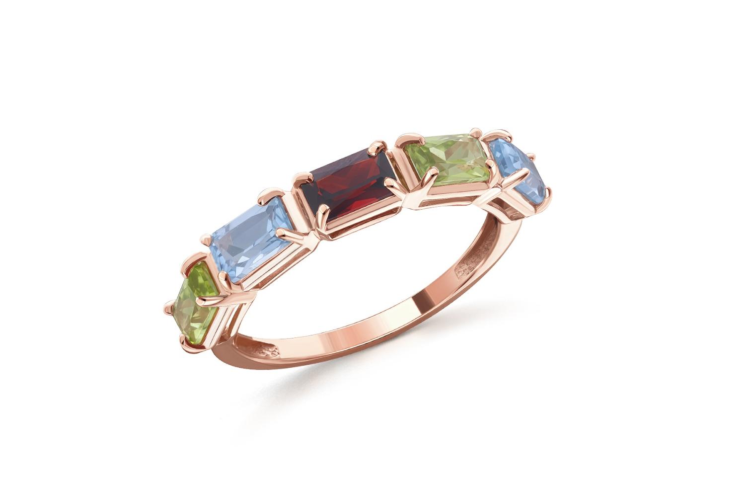 Мастера компании NEWGOLD, приложив всё свое мастерство и искусство, создали для Вас на нашем собственном производстве Кольцо Дорожка из красного золота с гранатом, топазами sky и хризолитами.