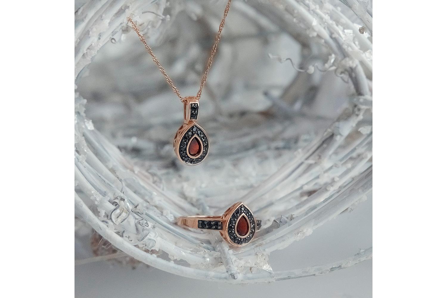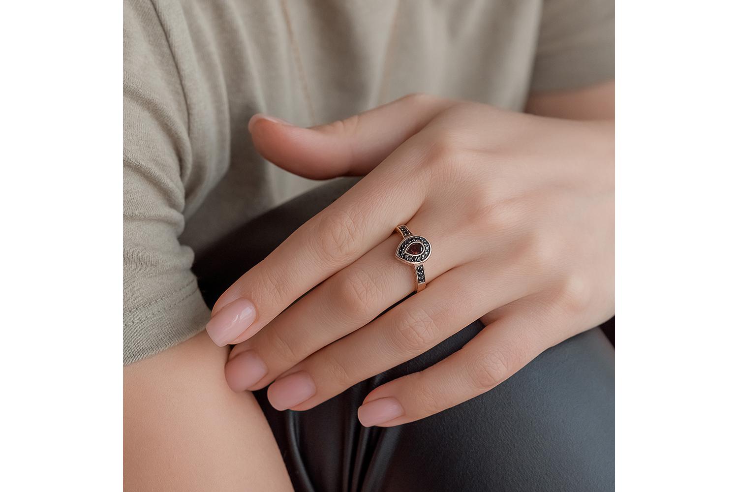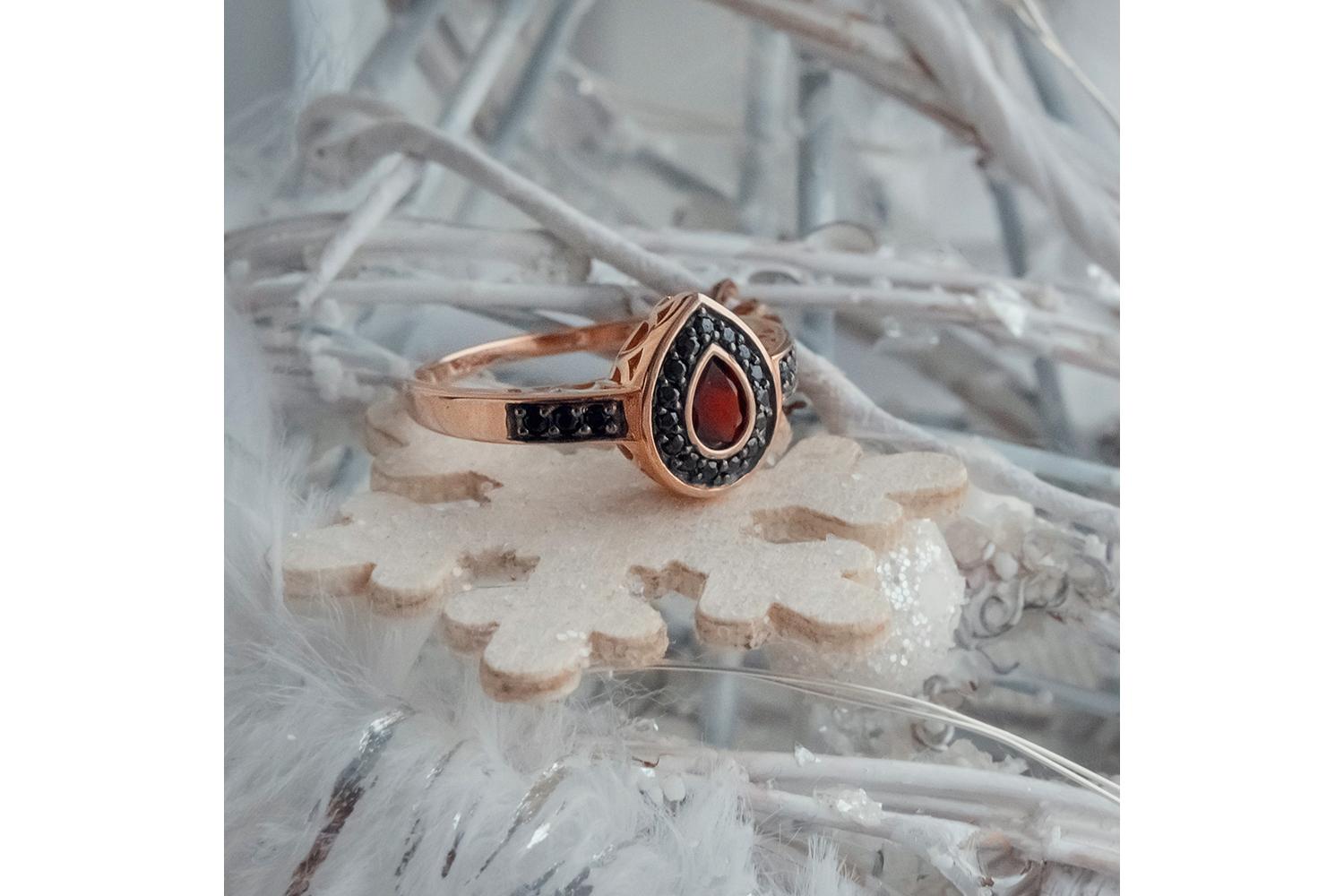 Гранат натуральный, количество 1 шт., огранка груша, размер 6ˣ4 ; Фианит чёрный, количество 6 шт., огранка круг, размер 1,5 мм ; Фианит чёрный, количество 15 шт., огранка круг, размер 1,25 мм