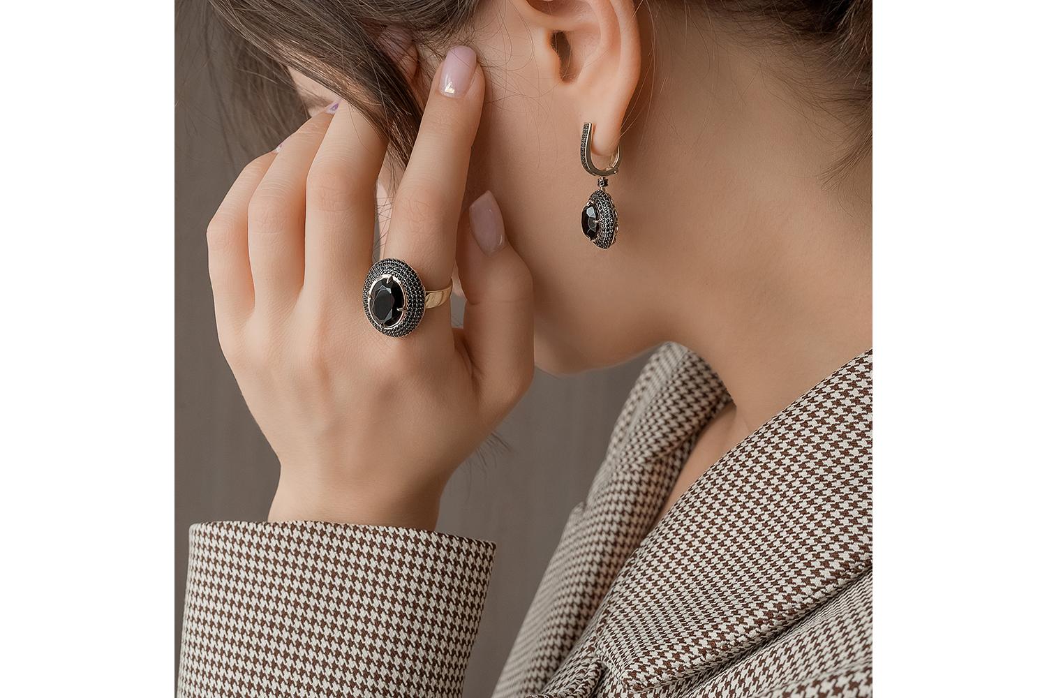Агат чёрный, количество 1 шт., огранка овал, размер 14ˣ10 ; Фианит чёрный, количество 184 шт., огранка круг, размер 1 мм