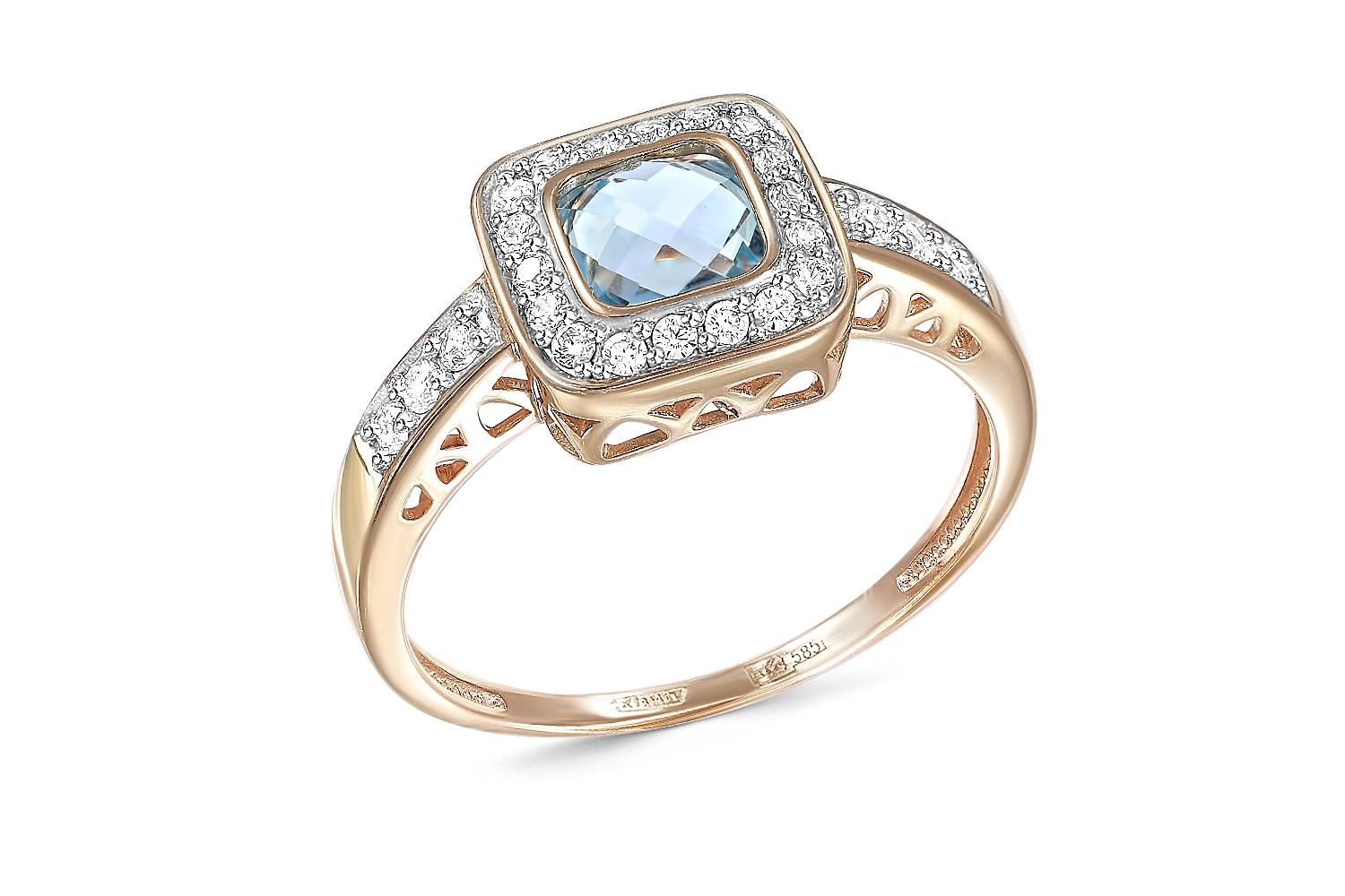 Мастера компании NEWGOLD, приложив всё свое мастерство и искусство, создали для Вас на нашем собственном производстве Кольцо из красного золота с топазом sky и 24 фианитами.