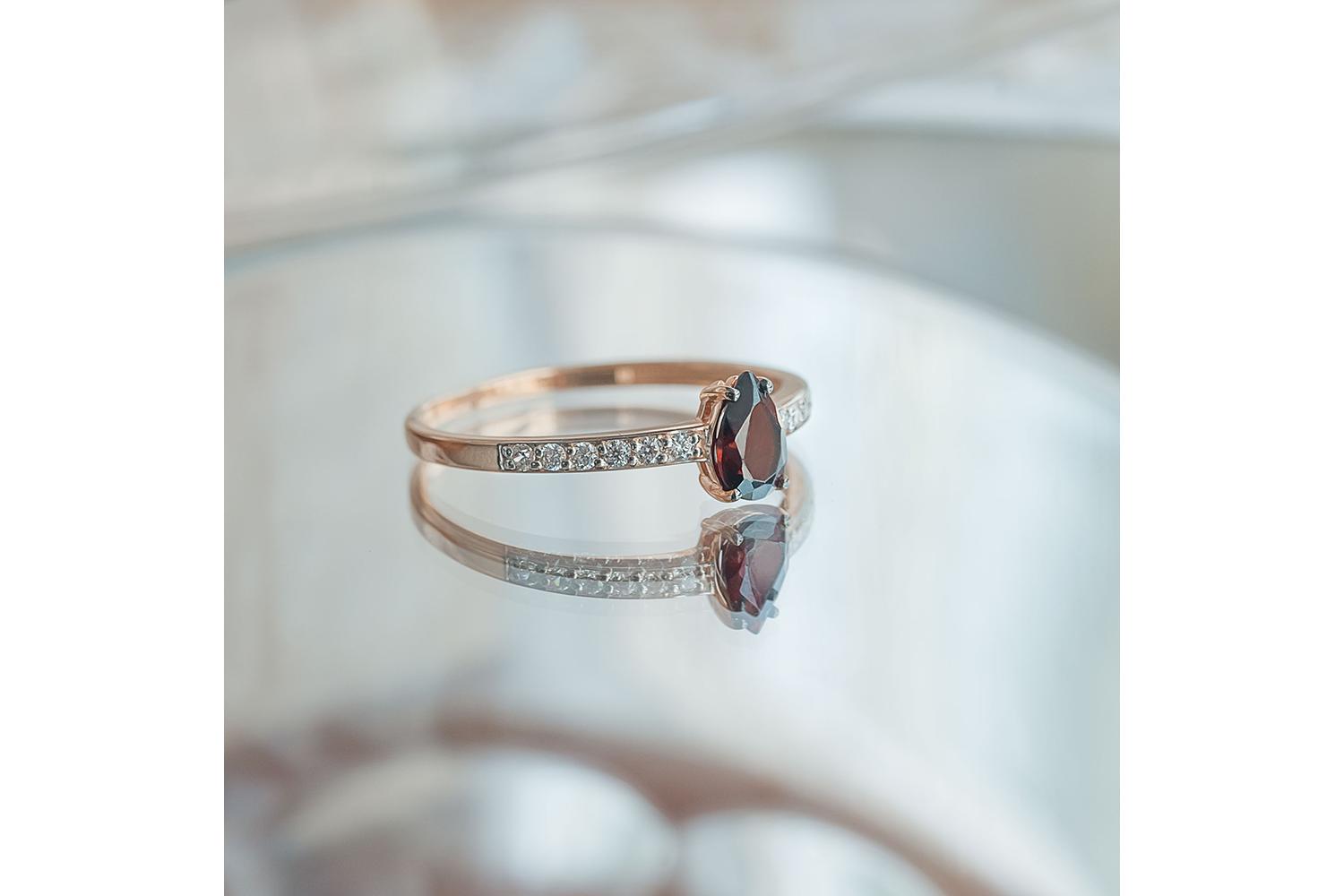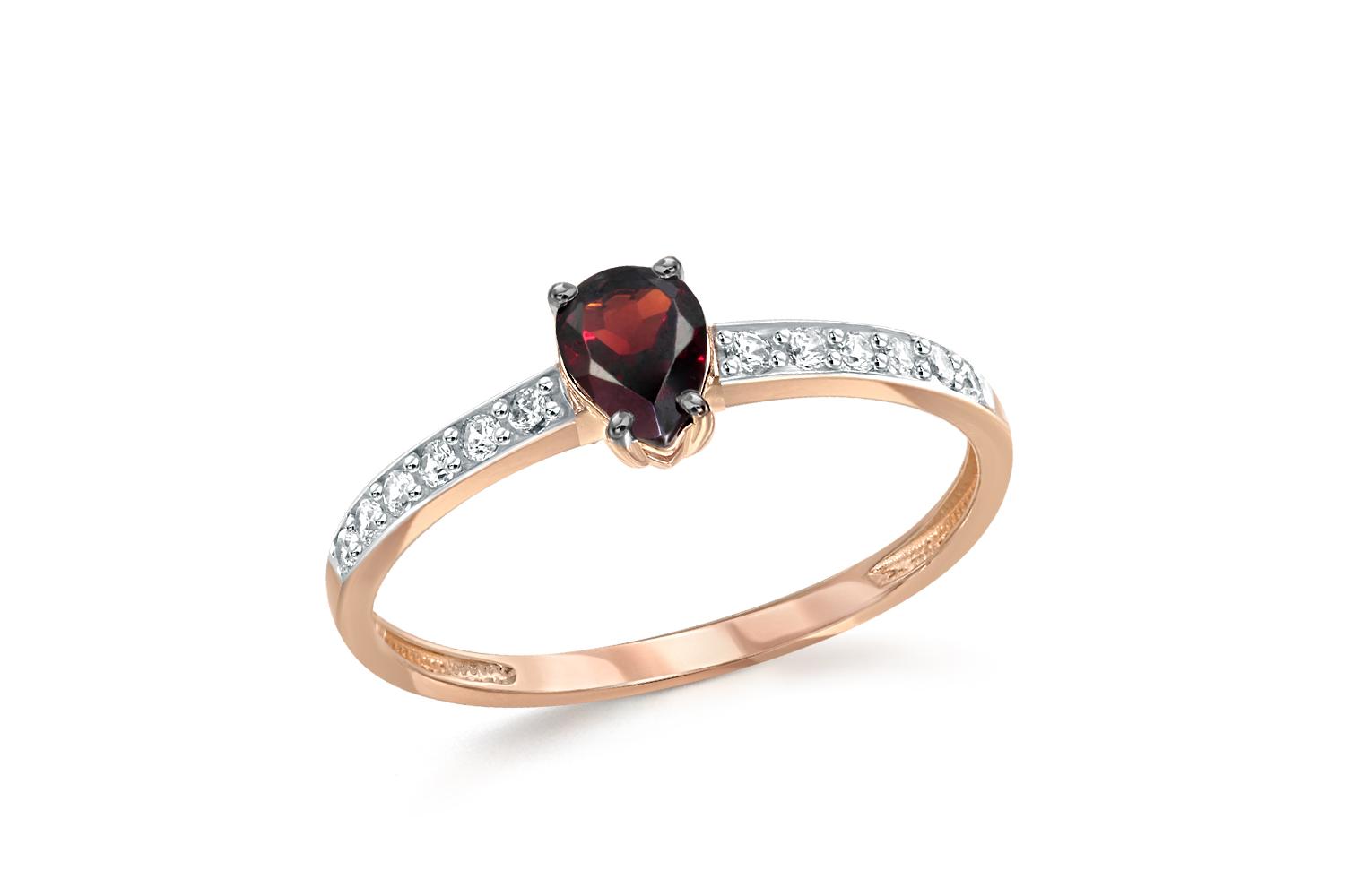 Закажите Кольцо из красного золота с гранатом и 12 фианитами с получением в Москве через курьерскую службу доставки напрямую с нашего производственного склада завода NEWGOLD!