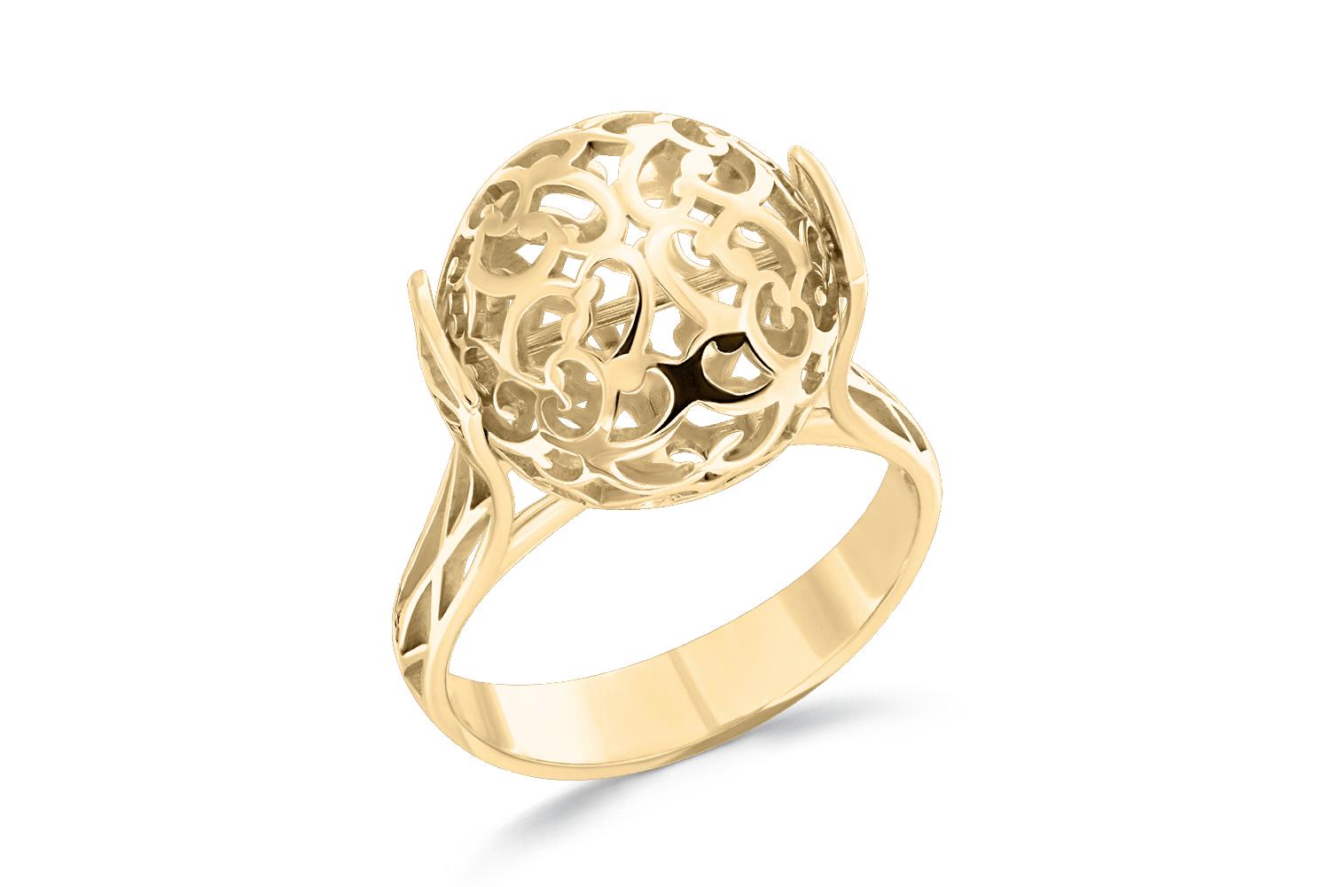 Ажурное кольцо-шар из желтого золота представляет собой истинное воплощение ювелирного искусства. Сфера с изящно вырезанными узорами создает впечатление невесомости и легкости. Филигранная работа мастера подчеркивает изящество формы - шар словно парит над основанием кольца, играя светом и тенью.
