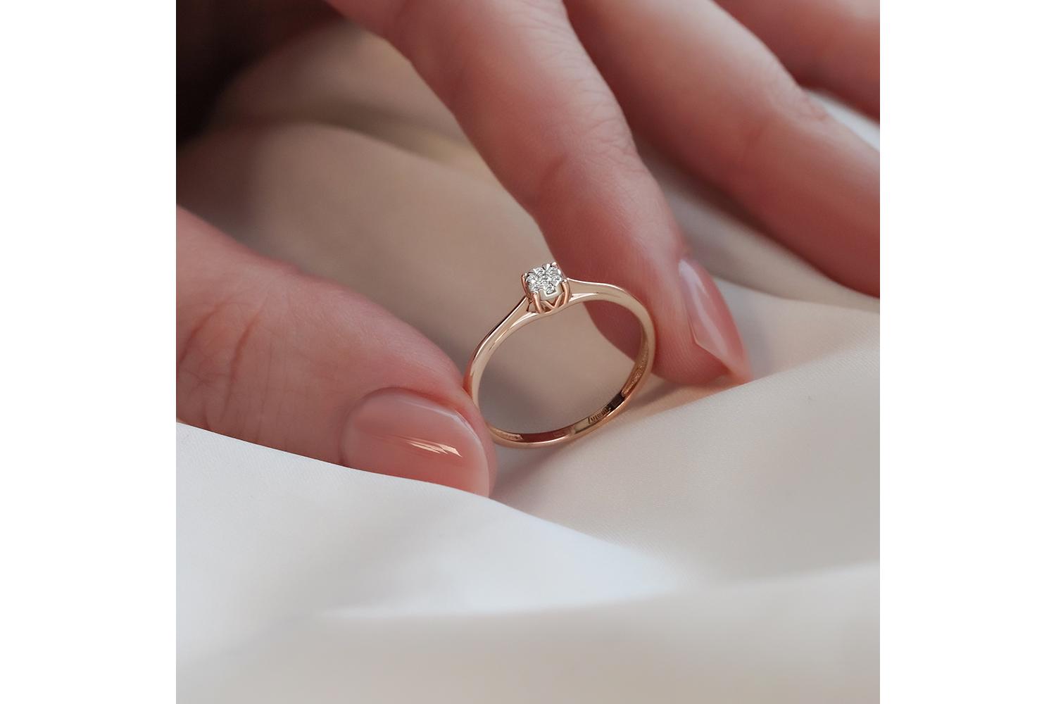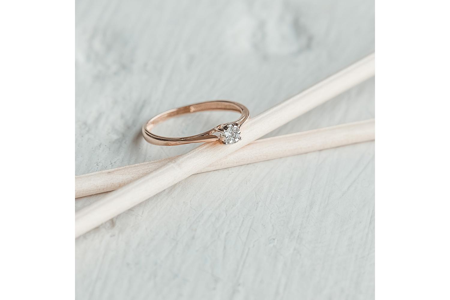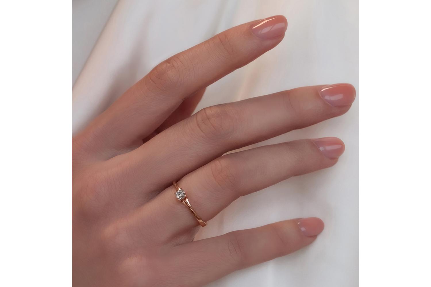 Это изящное женское кольцо выполнено из золота 585 пробы и украшено бриллиантами. Золотое кольцо станет прекрасным дополнением к вашему ювелирному гардеробу, подчеркивая стиль и вкус своей обладательницы. Блестящее исполнение классики в современном дизайне позволяет носить это ювелирное кольцо на каждый день или оставить для особых случаев, таких как юбилей, Новый год или день рождения. Кольцо можно комбинацировать с другими украшениями: цепями, серьгами, браслетами и кулонами.