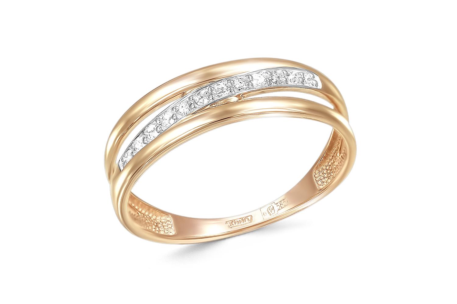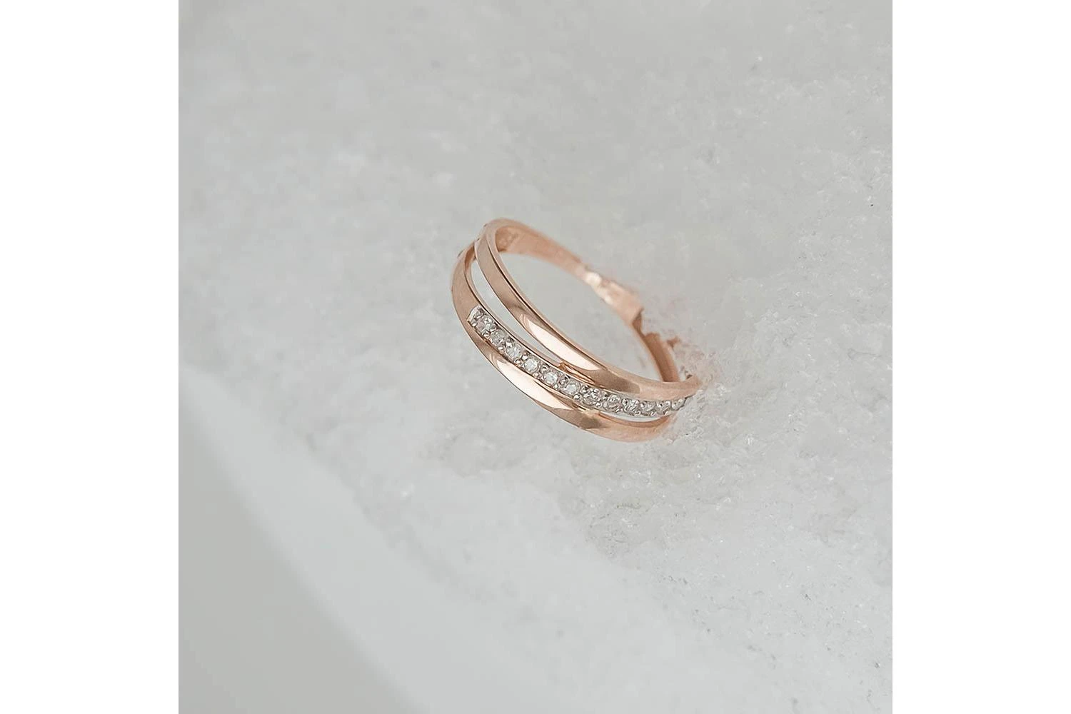 Плавные изгибы металла формируют гармоничную композицию: розово-золотистые дуги обрамляют белоснежную линию камней. Торцевые части кольца декорированы тонким рельефным узором, что придаёт изделию дополнительный объём и визуальную глубину.